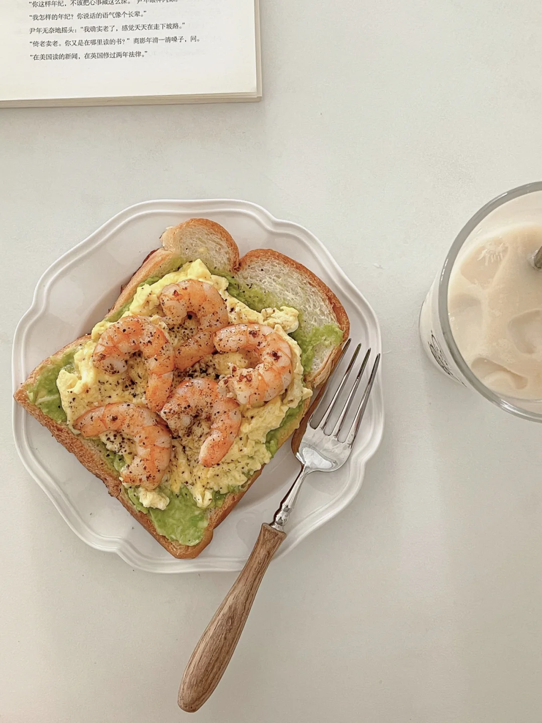 6.6早餐|经典组合搭配 爱了爱了[赞R] -连续喝2天拿铁 📝快手做法 虾仁去壳用黑胡椒料酒 腌制备用 牛油果捣成泥加入黑胡椒调味 备用 滑蛋部分: 2个鸡蛋加入适量牛奶 盐 黑胡椒打散 黄油锅底融化 小火把蛋液倒进去 注意 全程小火‼️‼️ 不停的用筷子或小铲子滑动 半凝固状态就可以关火 用锅的余温就够凝固剩下的蛋液了~ 虾仁 煎熟 吐司加热到微微焦黄酥脆 就可以开始组装啦[大笑R] 不喜欢牛油果的人也可以接受的一款美食搭配 推荐推荐 真的非常nice[赞R]