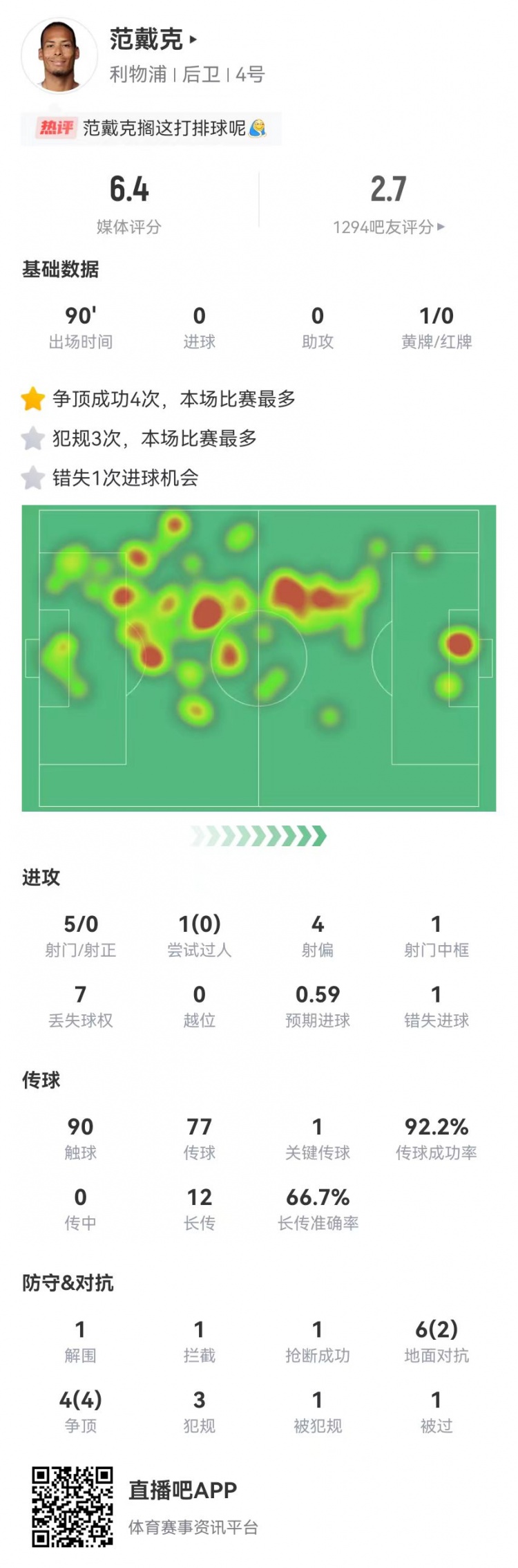 直播吧11月27日讯利物浦在本轮欧冠1-4惨败埃因霍温,范戴克本场数据如下: