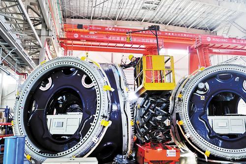 11月21日,在张家口明阳新能源高端装备制造产业基地,工人在组装风电主机。刘宝山摄