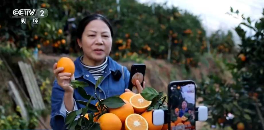 在赣州寻乌县龙塘村的一处果园里,果农朱慧珍正在自家地头忙着直播,她身后挂满脐橙的果树既是风景、又是货源。