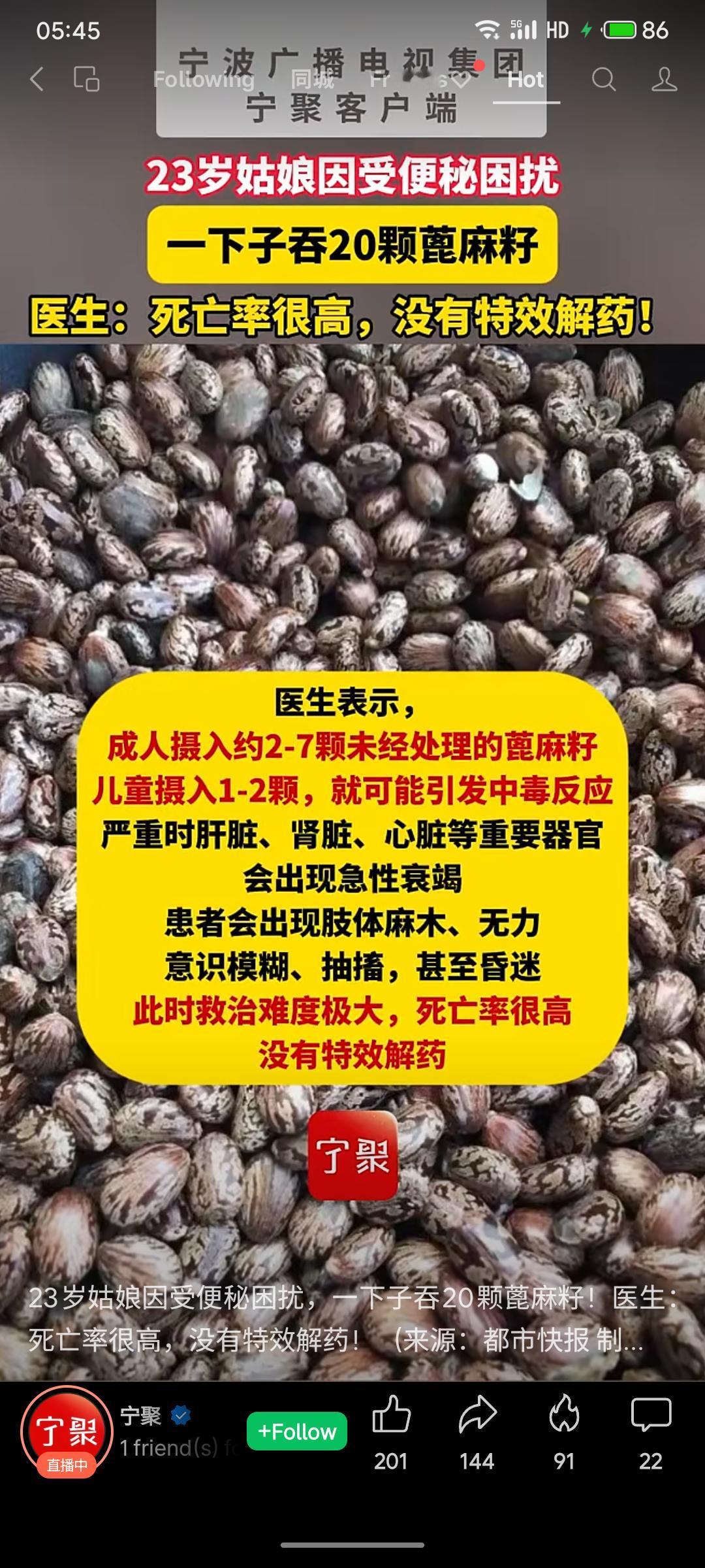 23岁女子因长期便秘,轻信偏方一次性吞服20颗蓖麻籽,随后出现恶心呕吐等中毒症状。医生指出蓖麻籽毒性极强,成人摄入2-7颗即可能中毒,会导致多器官衰竭且无特效解药。该女子经及时救治已生命体征平稳。
