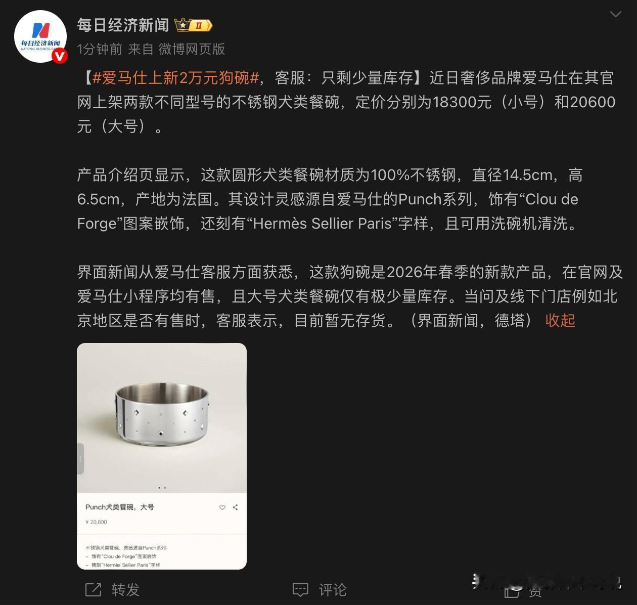 爱马仕一只狗碗标价两万,而且卖得还不错,看来还是贫穷限制了我的想象力。在我的印象中,一只狗碗的价格就是那么几元十几元钱包邮到月球的东西,稍微好一点的就是几十块钱,撑死几百元不得了了。如果有人告诉我一只狗碗可以卖到上千元,我会觉得他是在胡说。结果人家一上来就两万多,而且库存都不多了,看来还是深受富人们的青睐!我就很好奇,是不是用这只碗喂出来的狗要聪明一些?
