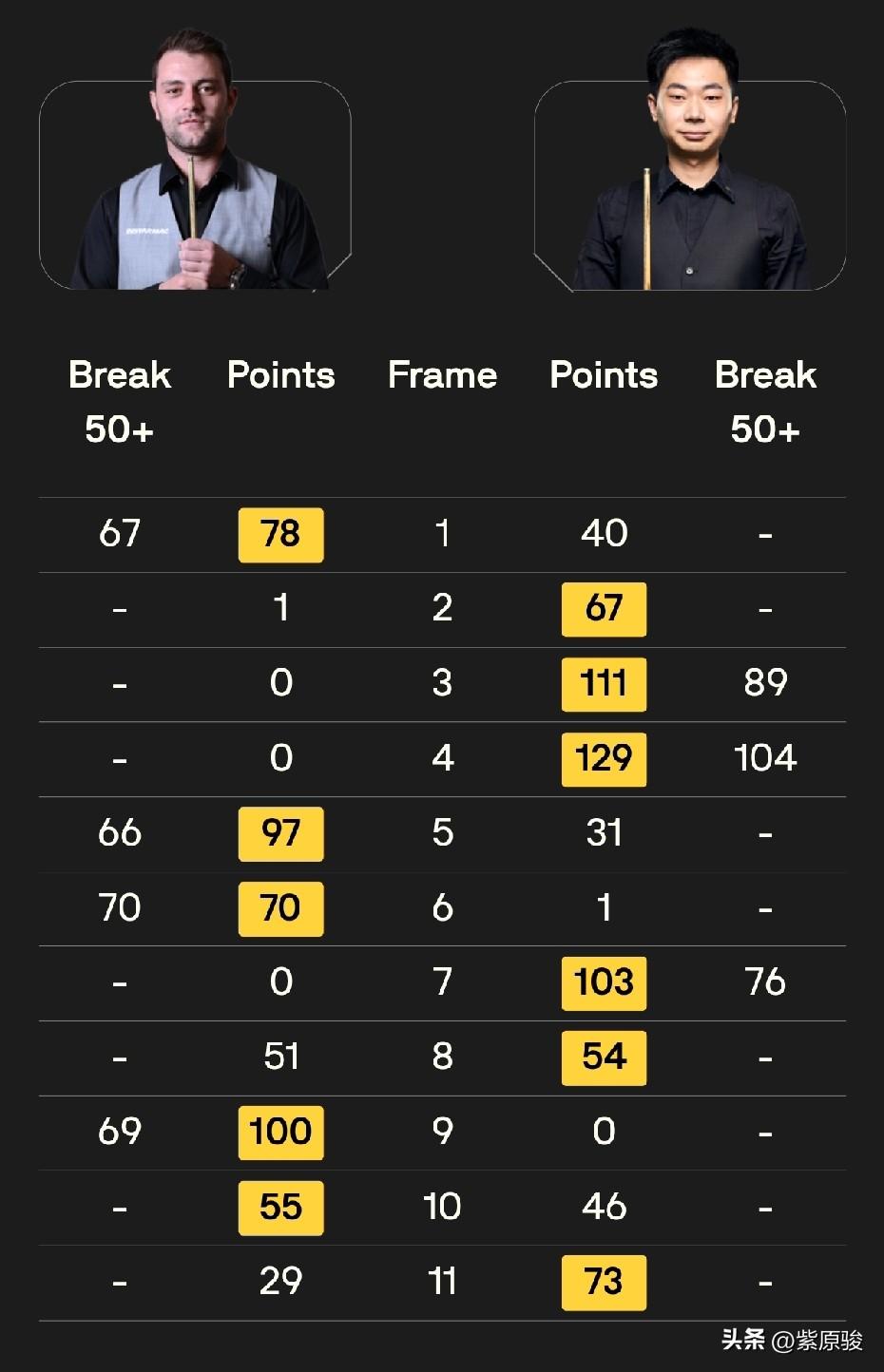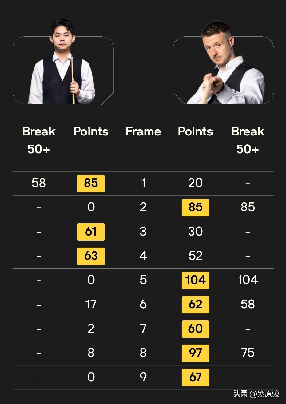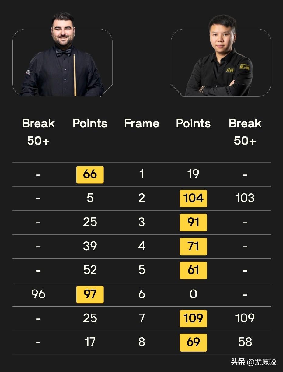 英锦赛资格赛第四轮,周跃龙、吕昊天获胜晋级正赛,袁思俊3-1领先遭霍尔特五连鞭,遗憾出局。晋级正赛的其他5人是:吉尔伯特、马奎尔、斯莱瑟、唐纳森、沃拉斯顿。二师兄宾汉姆最悲催,5-0领先被唐纳森六连鞭。刚刚结束的一场比赛,奥康纳5-6被沃拉斯顿逆转绝杀。 今晚明晨,张安达、雷佩凡等6名中国球员出战“审判轮”,争夺正赛席位。 周跃龙与克拉克的比赛刚刚结束,周跃龙6-2大胜。周跃龙一度4-1领先,被克拉克追了一局,这一局,周跃龙打得不好,失误不少,准度也不行。好在克拉克实力有限,之后两局被周跃龙顺利拿下。 整场比赛,周跃龙虽然打出两杆破百,一杆50+,但不算发挥出色的,只是对手表现不太好。希望周跃龙在正赛中能调整状态,提高专注度。 昨晚,吕昊天6-5绝杀米切尔·曼恩。曼恩本赛季表现不错,赢过多位名将,但这场比赛表现一般,与吕昊天形成拉锯战,5-3领先被对手连追两局,好在决胜局吕昊天把握住了机会,绝杀对手晋级正赛。 袁思俊在与霍尔特的比赛中,明显后劲不足,3-1领先,被对手五连鞭,3-6被淘汰,无缘正赛。 其他5场比赛的结果是:马奎尔6-1大胜伯恩斯,吉尔伯特6-4胜威尔斯,斯莱瑟6-4胜舒尔蒂。宾汉姆太悲催,5-0领先被唐纳森连赢6局。刚刚结束的最后一场比赛,奥康纳一度4-1、5-4领先沃拉斯顿,结果5-6被沃拉斯顿逆转绝杀。决胜局,沃拉斯顿超11分,奥康纳做斯诺克缩小到3分,后又扩大到8分,之后继续疯狂做斯诺克,但还是没有翻盘。这个决胜局可以称为“疯狂斯诺克”。 今晚明晨,6名中国球员出战第四轮,具体时间和对阵如下: 21点: 庞俊旭vs桑坎姆 龙泽煌vs希斯科特 明天凌晨3点: 张安达vs塔猜亚 徐思vs福德 雷佩凡vs吉米·罗伯逊 贺国强vs勒克莱尔。 中国球员,加油!