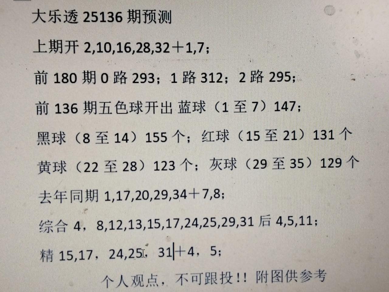 大乐透25136期预测 上期前区无0路号。三个1路号,两个2路号。全偶数!本期估