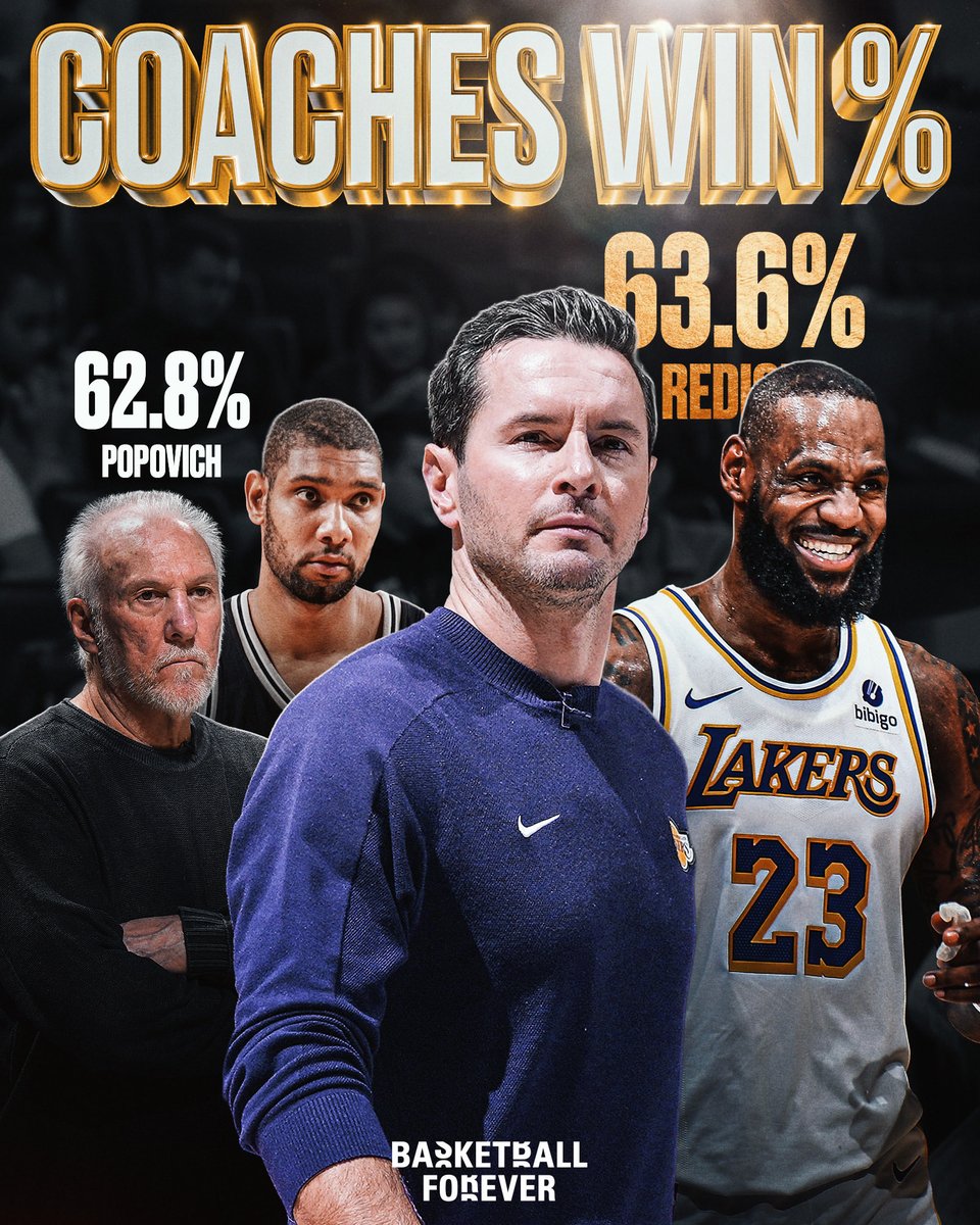 赛后,美媒BasketballForever晒出一张照片并配文:JJ-雷迪克在湖人执教时,在前三节领先的比赛战绩是57胜4负,创造NBA历史纪录。同时,雷迪克的执教胜率目前已暂时超过马刺功勋主帅格雷格-波波维奇。