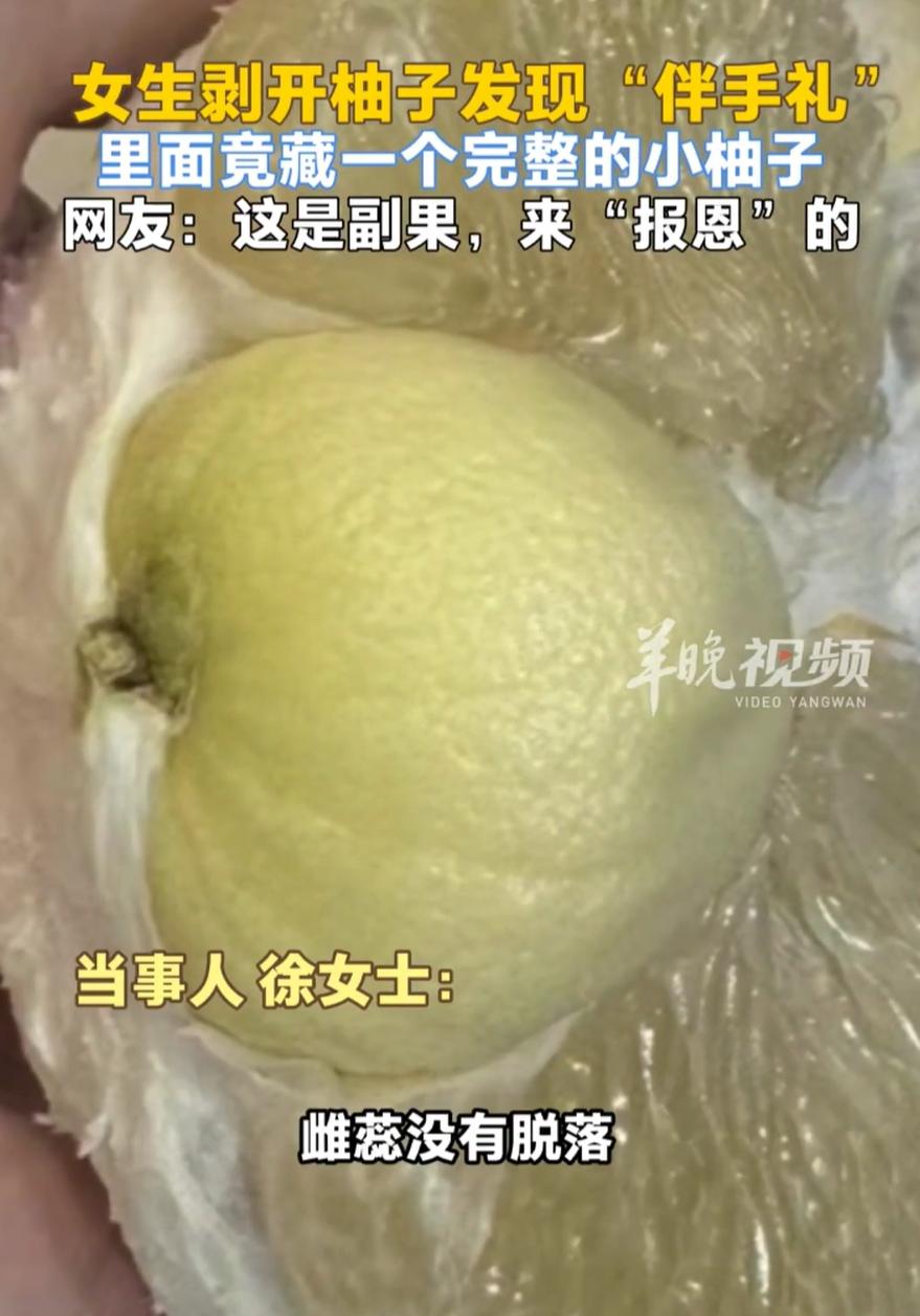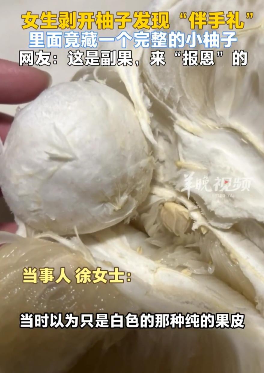 “报恩果?”四川成都,女子买了一个柚子回家吃,可剥开柚子后就发现中间有个部分是空的,本来还很生气,可接下来却发现里面竟藏着一个完整小柚子。网友:这是副果,来“报恩”的! 徐女士介绍,当时剥柚子时先发现中间是空的,里面有一坨白色的东西,她第一反应是纯果皮,还想着够倒霉的,碰上了一个发育不全的果子。可再仔细剥开那团白色部分,里面居然藏着一个完整的小柚子,形状小巧,果肉清晰,这让她觉得很有意思 网友把它叫副果,其实这是个挺正常的植物现象,这叫“副果”或“子房双生”现象 简单说,就是在柚子生长过程中,可能因为授粉、温度或养分分配等原因,其中一个子房没有正常发育,反而被主果子包裹在内,形成了果中果 它虽然看起来像独立的,但通常口感可能偏酸或偏硬,和主果不太一样。这种情况在柑橘类水果中偶尔会出现,不算质量问题 事情传到网上后,大家的反应也挺真实。有人觉得像是大柚子给了个回头礼,有人第一次知道原来果子还能套娃,还有人表示买到这种柚子不亏,算是遇上了水果界的隐藏彩蛋 这事看着小,却挺有意思,有时候生活就会带来各种各样的惊喜,大柚子里多出一个小柚子,不值钱,却能换来一个好心情,也算划算