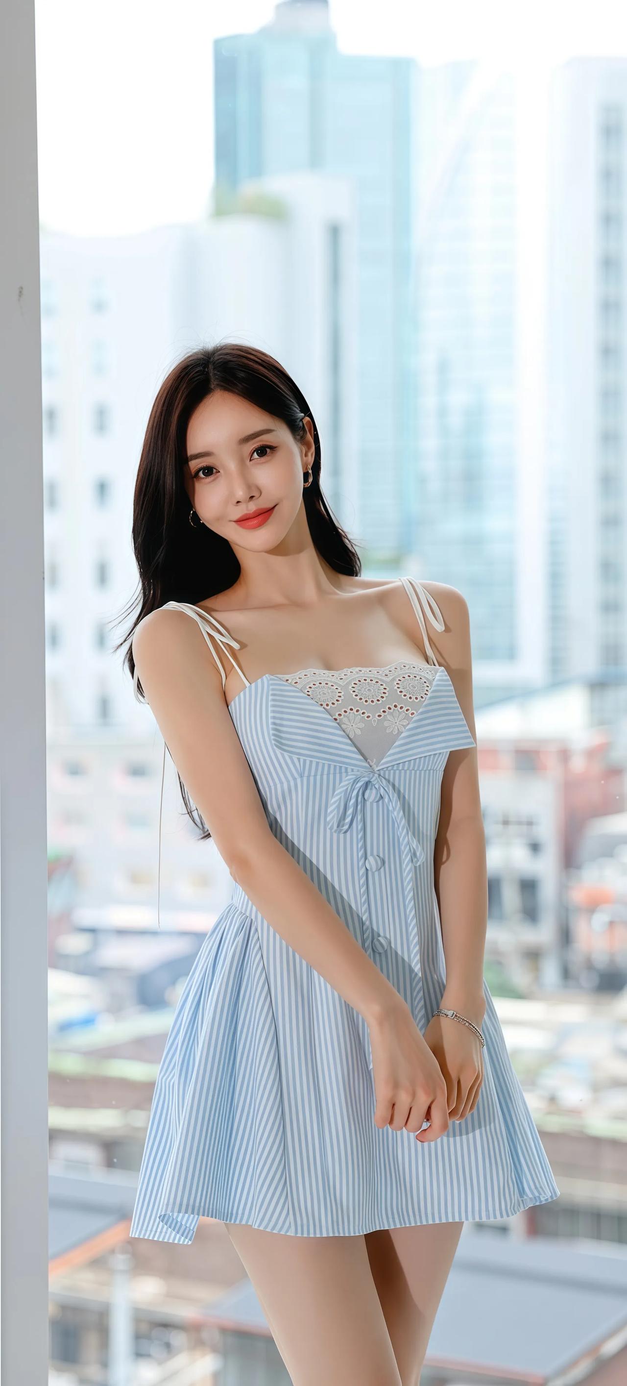 都市时尚少女,蓝白条纹连衣裙,都市天际线背景,优雅气质