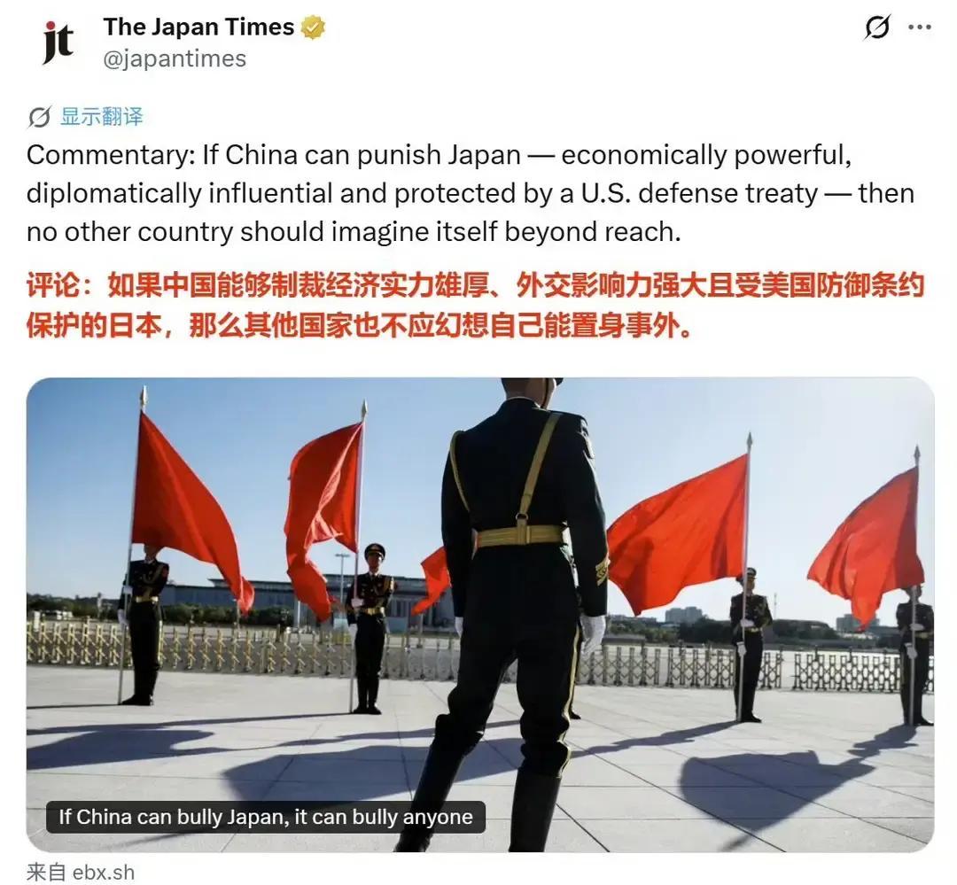 日本时报发文称,中国一反常态的凶猛反击,是赤裸裸的向日本及其盟友美国发出警告,日