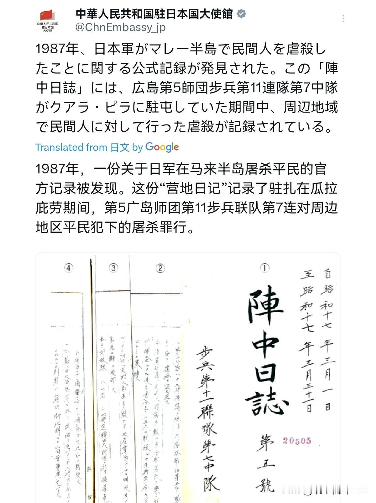 中国驻日大使馆继续回敬!就看黄循财自己尴不尴尬!11月27日,中国驻日大使馆刊出日文文件写到,1987年,日本军队在马来半岛屠杀平民的官方记录被发现。这份《阵中日志》记载了广岛第5师团步兵第11联队第7中队驻守瓜拉庇劳(Kuala Pilah)期间,在周边地区对平民实施的屠杀行为。 很显然,我们大使馆进行这样的刊文,当然是继续对高市早苗施压,让日本民众充分意识到日本军国主义给亚洲国家人民带来的深重灾难。某种程度来说,我们这也是回敬新加坡总理黄循财。黄循财不是声称,东南亚国家与日本已经和解,劝我们放下历史,并称日本是东南亚最受信任的大国,并附和日本关于钓鱼岛的称谓吗? 我们翻出这样的历史事实,就是告诉黄循财,对于日军屠杀的历史,任何一个有良知的人,都不能够如此轻飘飘的说放下。新加坡能够代表马来西亚吗?高市早苗意图让日本军国主义还魂,新加坡是一点都不警惕吗?我们不知道东南亚国家是如何与日本和解的,但是在日本不对我们出具具有法律效力的书面认错文件的情况下,任何国家都无权要求我们跟日本和解! 黄循财可以忘记日军屠杀的历史,但我们不会忘,我们没有资格替受难的同胞原谅日本侵略者。黄循财信任日本,这是新加坡的事情,我们无权过问。但给军国主义掩护,辩解,我们有权力不接受。而在钓鱼岛问题上,我们希望新加坡说话有分寸一点,在领土问题上,新加坡最好不要当挑衅者。