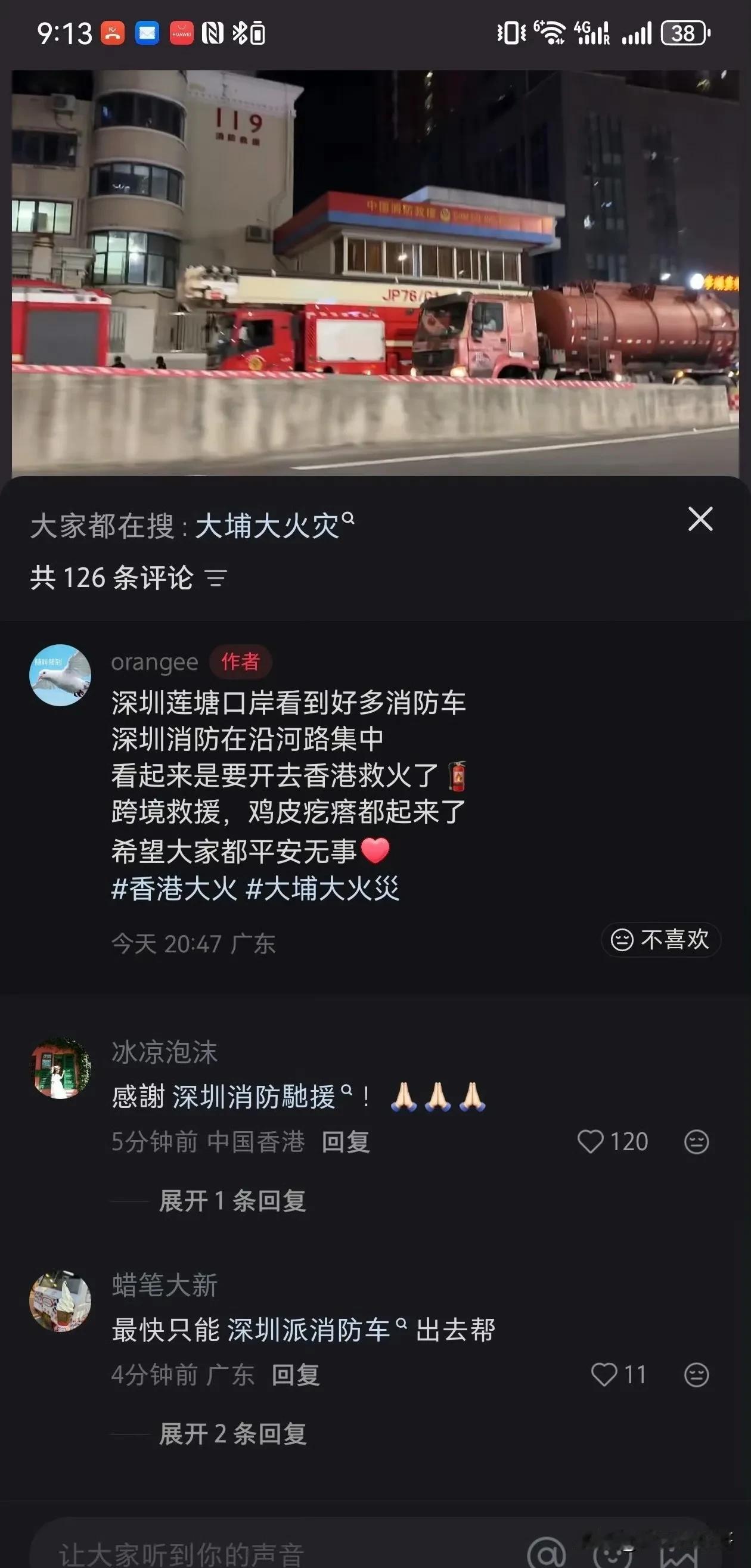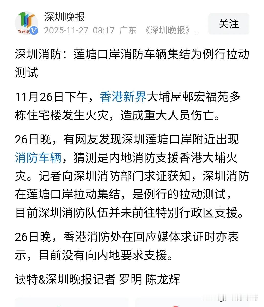 原来是集结拉练,这下尴尬了! 大家都以为昨晚在莲塘口岸集结的深圳消防车准备驰援香港大埔火灾现场,但是据最新消息根本不是如此,而是在例行应急拉练测试。 虽然是如此,但是也说明深圳这边的百米消防云梯已经准备了,随时可以出发! 只是可惜了,没有过去对面参加实战的机会。