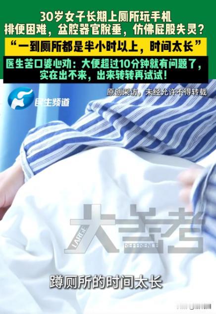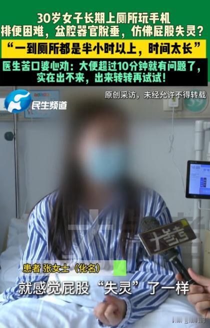 “悲剧还是发生了!”据媒体11月12日的报道,河南郑州,一女子长期上厕所时玩手机,一蹲就是半个小时,仿佛屁股失灵了一样,一点感觉都没有,不依靠药物的话一个星期都排不出来!女子去医院检查,被诊断为盆腔器官脱垂。医生:超过10分钟就有问题了! 据媒体报道,这名郑州女子已有多年如厕时玩手机的习惯。每次上厕所,她都会带上手机,刷聊天、短视频、甚至玩游戏。 大多数时候,她说是“静静地躲在小空间里喘口气”,但很多人都不理解:“蹲个厕所为什么要这么久?” 她自己也曾调侃,“可能把厕所当休息室了吧”。 这样的“休息时间”并不轻松:她半个月才去医院一次,排便越来越困难。如果不靠药物,一星期也排不出来,一蹲下来坐着一两部手机的时间也少不了。 慢慢地,她发现自己的盆底有异样,“仿佛屁股一点感觉都没有”,有时候就像“失灵”了一样。 她要靠药物刺激才能排便,否则就困难重重。起先她还以为只是普通便秘,没想到背后竟是严重的器官问题。 在一次腹压大、药物也无效后,女子终于决心就医。医生为她做了详细检查:盆底肌力下降严重,盆腔支撑结构松弛,最终被确诊为 盆腔器官脱垂。 这是一个医学名词,指盆腔内的器官(如直肠、膀胱、子宫等)因支撑组织功能减弱而下坠或突出。 医生指出,在她长期如厕时高强度持续腹压作用下,盆底肌群负荷过重,加之括约肌和支撑韧带疲劳,最终导致器官松弛下垂。 更令人警惕的是,这并非极罕见现象。 报道指出,因不良如厕习惯(尤其是玩手机时间过长)引发盆底问题的年轻病例正在增多,“蹲厕所时间远超医学建议的 5–10 分钟” 医生还说,这名女子的情况在早期较可控,但如果继续拖延、仰赖药物、而不纠正如厕习惯,将来可能出现更严重的问题,比如直肠黏膜内套叠、括约肌松弛,甚至出现阴道或直肠前壁突出等。 这条新闻一出,瞬间在微博、小红书、抖音等平台刷屏。评论区可谓炸开了锅: 震惊派:“真是太可怕了!上厕所还要定闹钟才行吗?” 劝诫派:“上厕所就做正事,不要把马桶当休息室。”、“这习惯,谁教的?” 反思派:“现代人离不开手机,却慢慢把自己身体‘玩坏了’。” “这不是一个人的问题,是一个时代的问题。” 不少健康博主也借此话题发声:提醒大家控制如厕时间、养成健康排便习惯,还顺带科普了 “盆底肌训练”(如凯格尔运动)和饮食建议。 还有声音指出,这反映了一个更深层的问题 —— 现代人休息和逃避压力的方式:上厕所不仅是生理行为,也被不少人当成逃避现实的小角落,用手机来缓解焦虑、逃避烦恼。 但这种“短暂逃离”其实是在为身体埋雷。 针对这一现象,报道中医生给出几点建议:如厕时间控制:每次上厕所建议控制在 5–10 分钟 内。一旦超过 10 分钟,就可能对盆底构成伤害。 中断习惯:如果实在一次排不出来,可以暂时起身活动,再回来,避免长时间维持蹲厕姿势。报道称,“上个十分钟出来走一走,动一动,二十分钟以后再尝试”。 生活方式干预:均衡饮食,多吃膳食纤维、水果、蔬菜;多运动,以增强整体肌肉和盆底肌;练习 盆底肌运动,如缩肛运动、凯格尔等。 及时就医:如果出现排便困难、经常“憋不出来”、依赖泻药,或感觉盆底下坠、坠胀、敏感度低等症状,应尽早到医院检查。