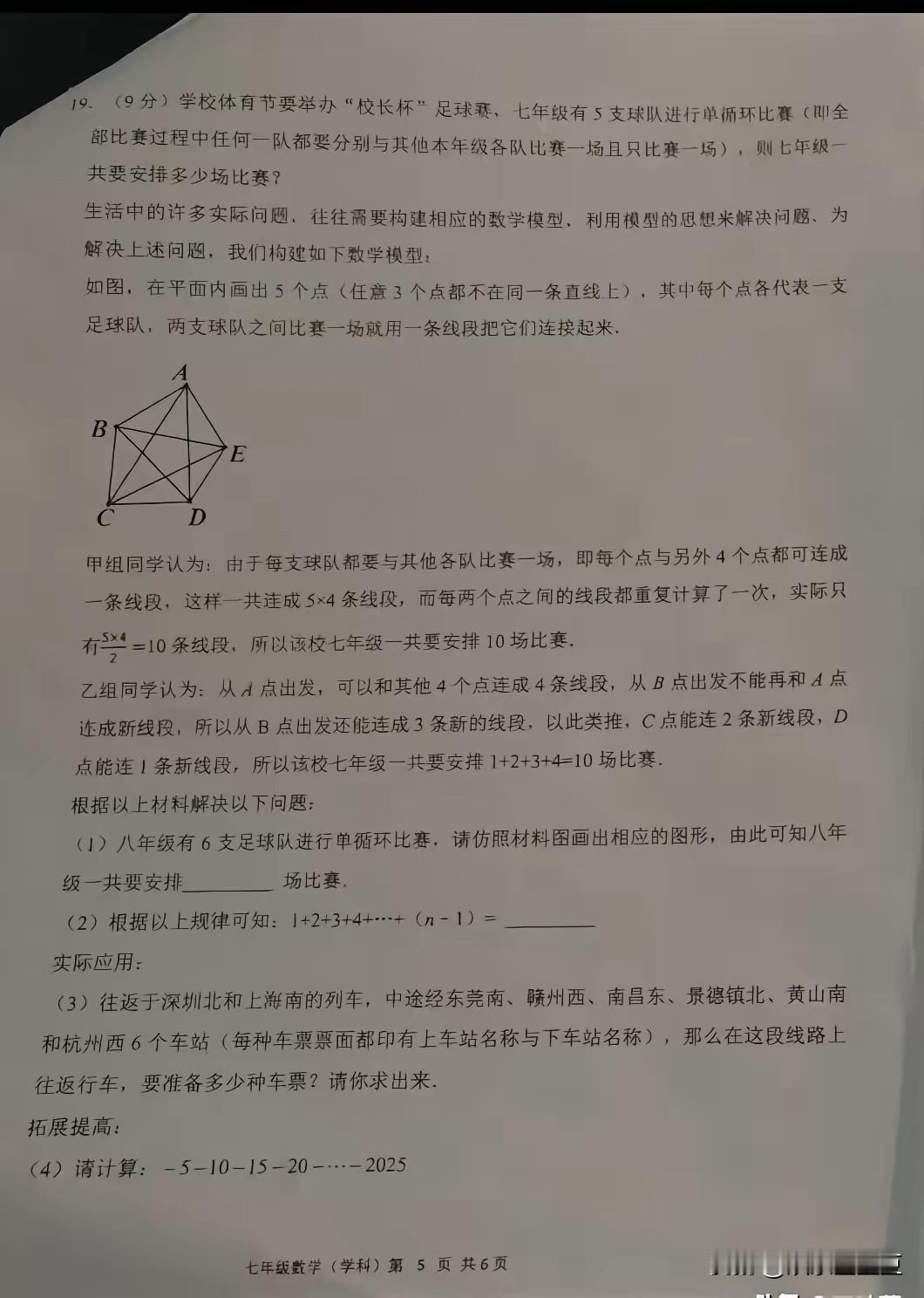 你没看错,这是初中数学试卷,不是语文试卷。你看这张卷:前半页在讲“校长杯”足球赛规则,从5支球队单循环赛讲到线段连点模型,字多到以为在看体育赛事策划案;翻到后面,列车车票、数列求和又裹着大段场景描述——合着数学题现在流行“长篇小说式命题”了。 审题就是一个问题,先得读通300字“应用题背景故事”;刚理清足球赛和线段的关系,又要从列车站点里扒数列规律。主打一个“数学知识点藏在作文题里”,做卷像拆盲盒:你永远不知道下一段文字,是题干还是阅读理解材料。 只能说数学老师把“生活情境”玩明白了——不知道还以为“这是考语文”。 所以,做数学题,审题,抓关键信息,提炼数据,转换成数学语言用符号表达出来,这就是建模的过程。这也是解题的第一步。