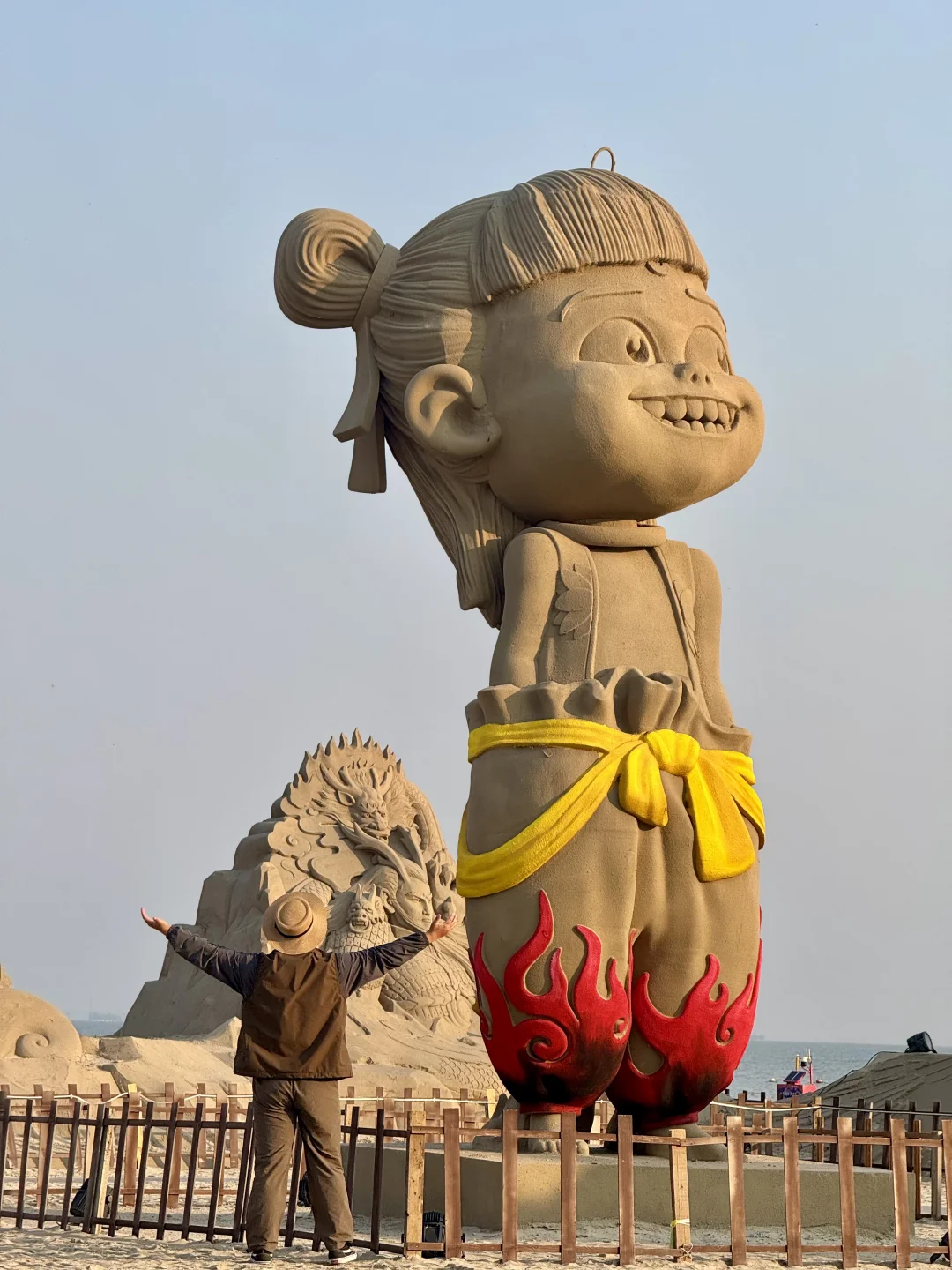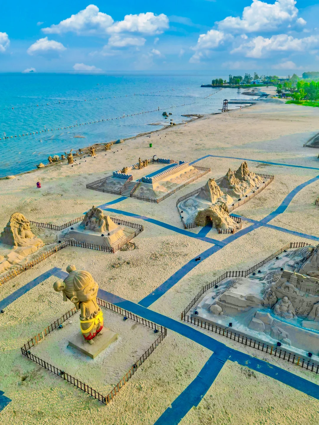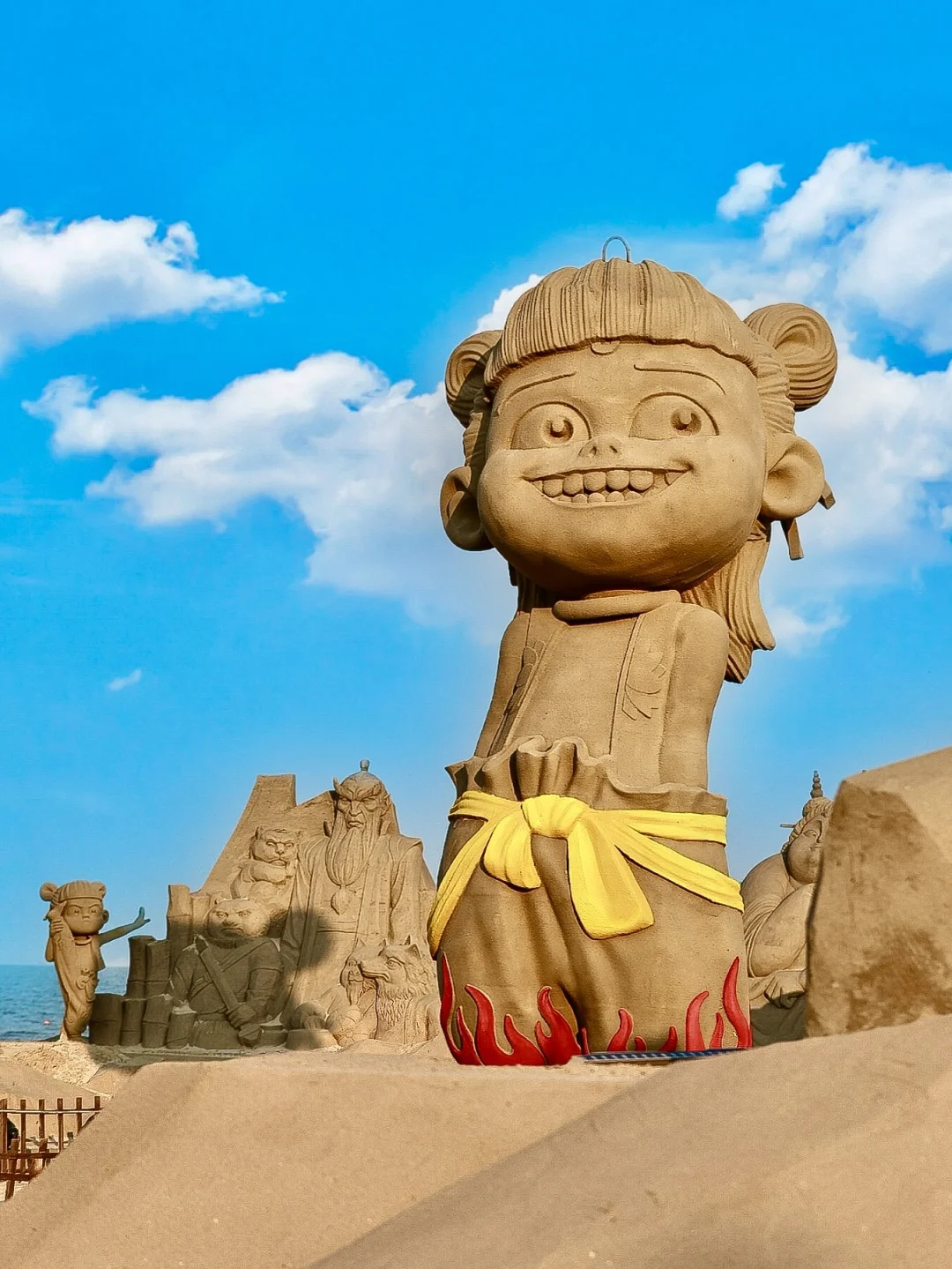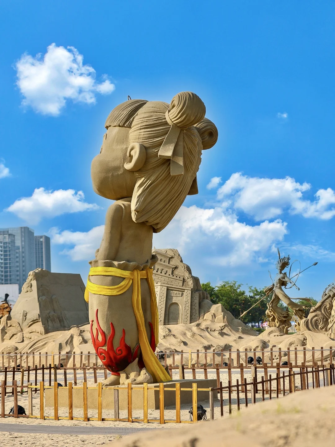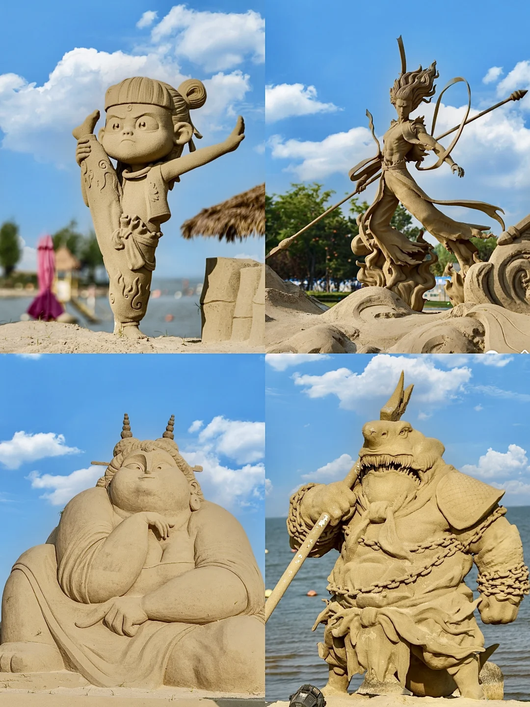 就在骆马湖沙滩公园,以“梦幻西游上古神话”为主题,制作悟空、哪吒、敖丙等造型沙雕和场景沙雕,真的很震撼🥹