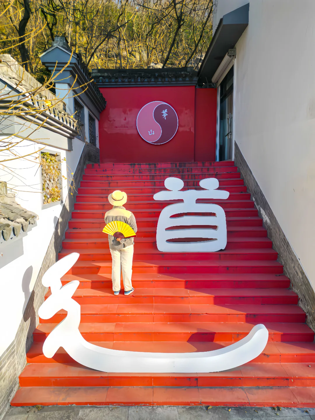 可以以33米老子雕像为背景拍照,也可以上二楼拱桥处,从下往上拍