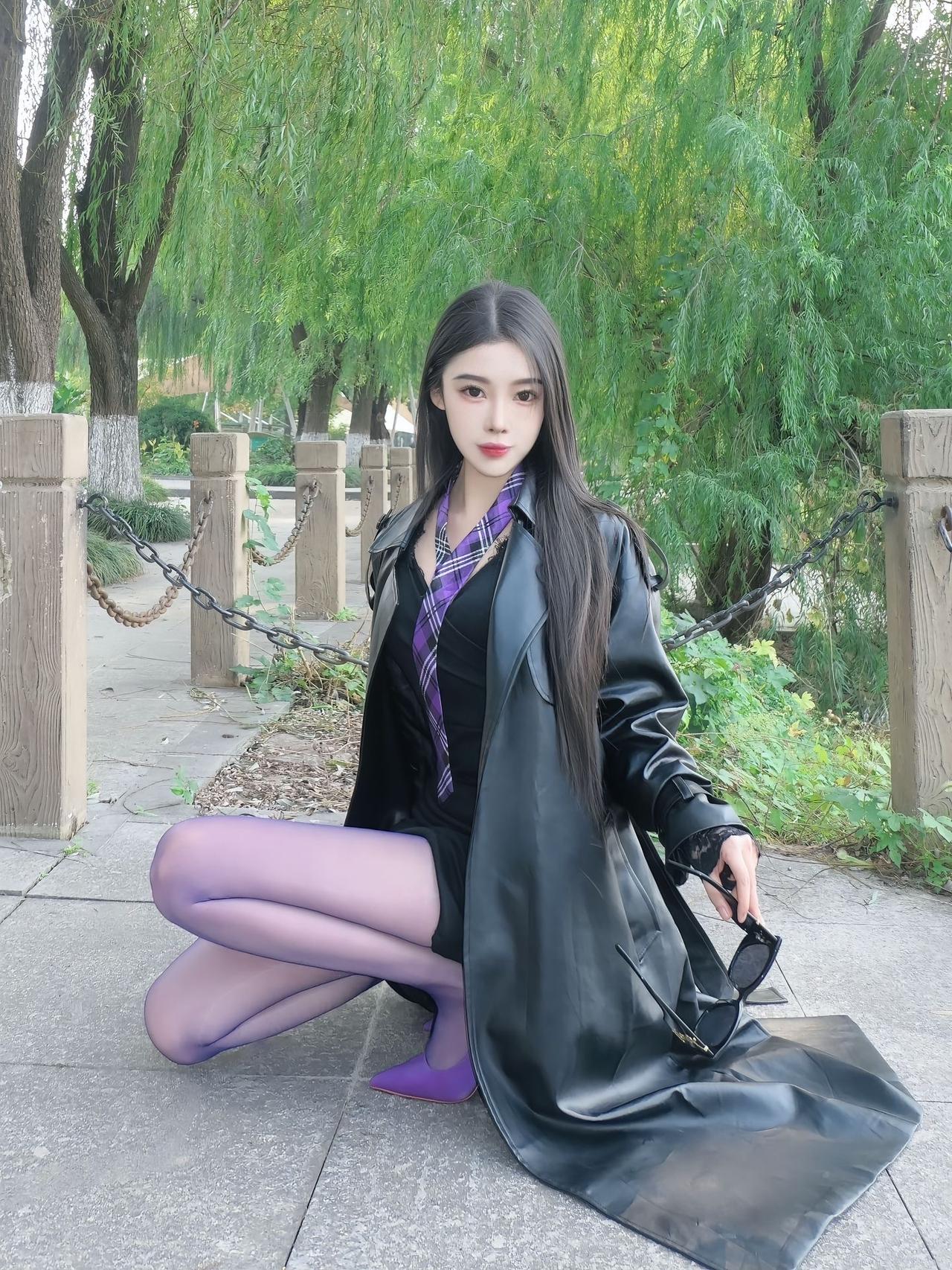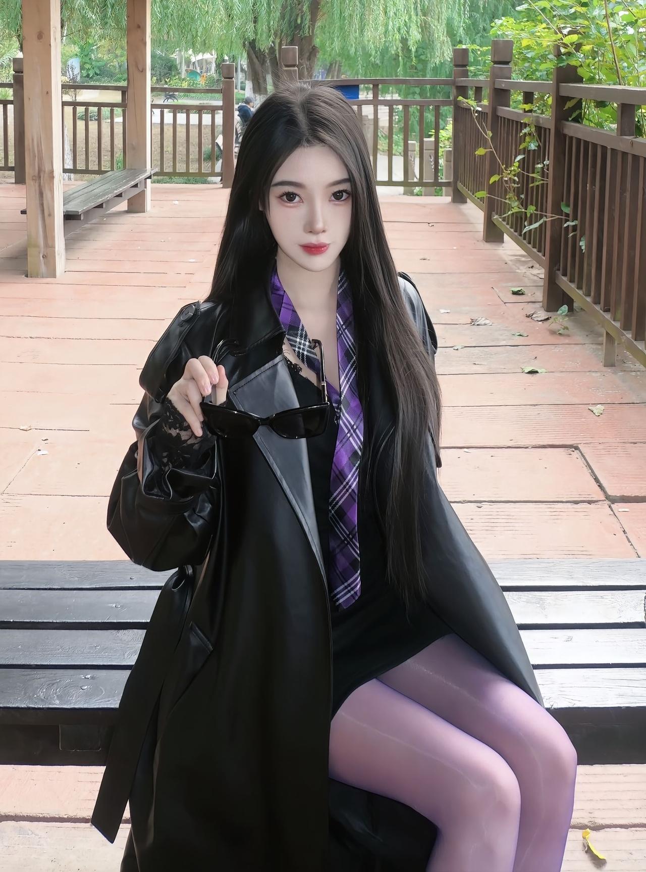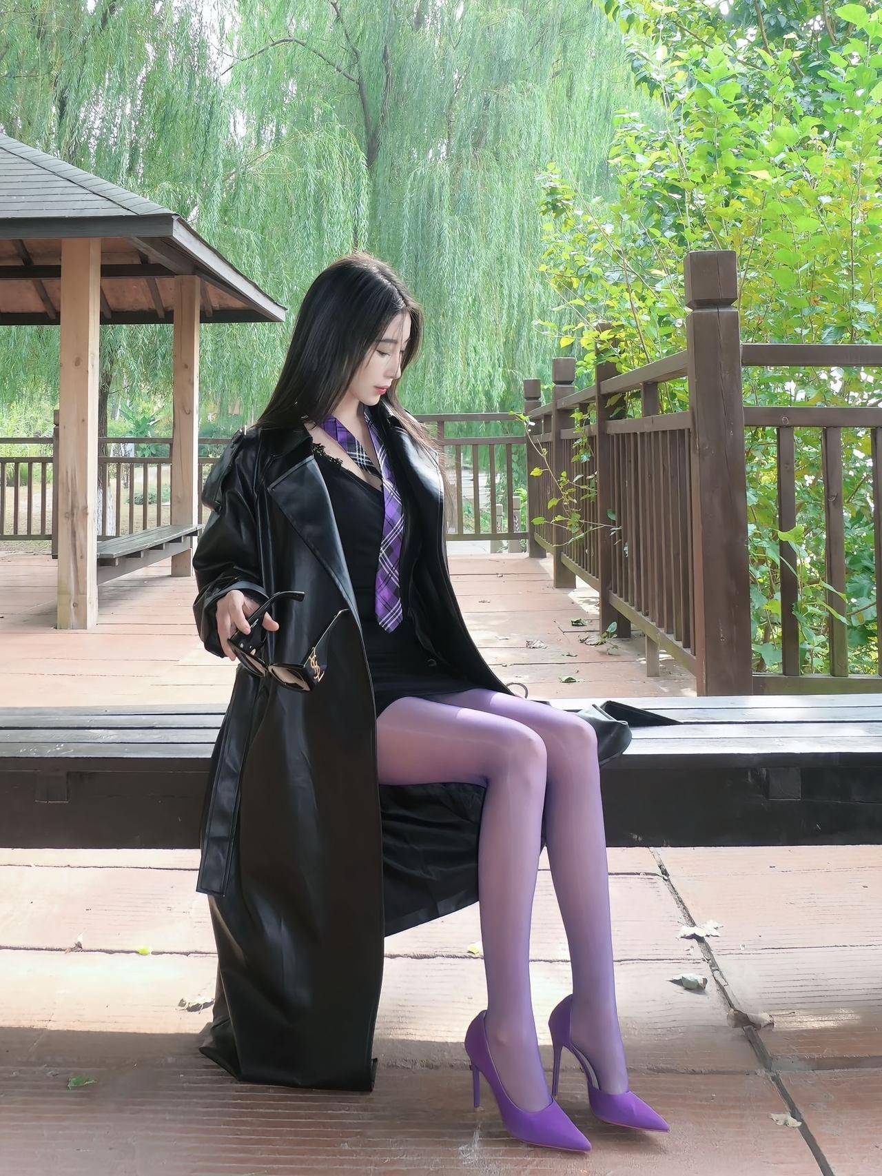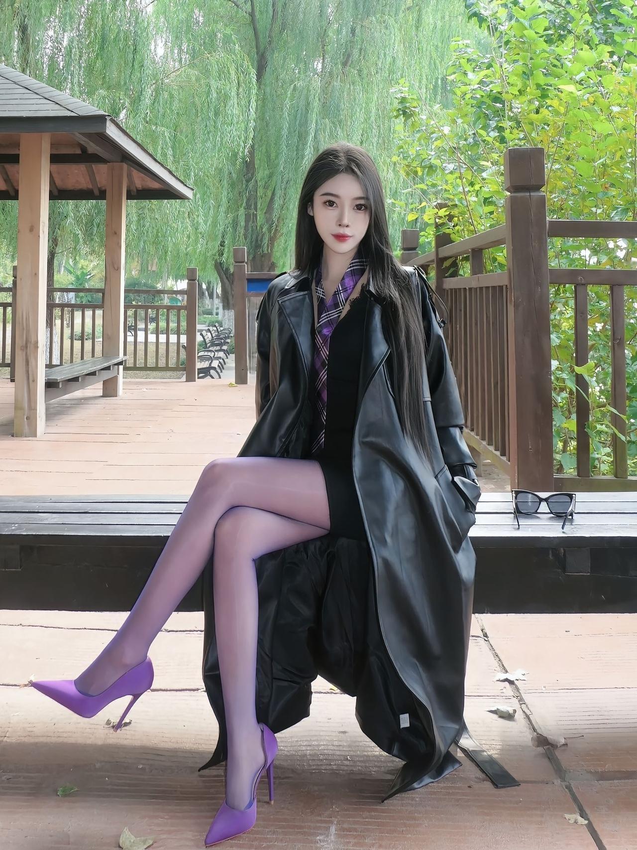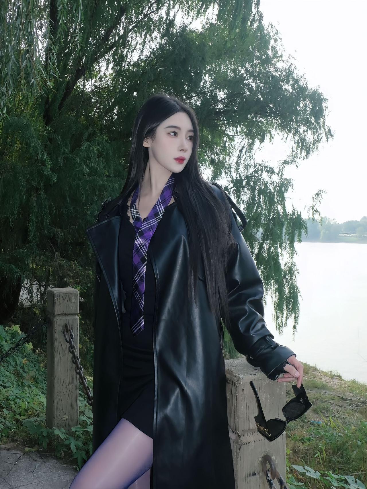 秋日公园的“冷感美人”!黑皮衣+紫调穿搭太戳审美 谁能拒绝秋日公园里的冷感美人穿搭? 黑色皮质长风衣自带松弛贵气,oversize版型把“慵懒飒爽”焊在身上;内搭小黑裙+紫格领带,甜辣平衡得刚好!最绝的是淡紫丝袜+同色系高跟鞋,顺色搭配直接把腿长拉到脚踝,清冷又钓系的氛围瞬间拉满~ 随手拿墨镜当道具,松弛感拍照姿势直接抄作业!这套穿搭把“冷艳”和“温柔”揉在一起,秋日出街回头率直接爆表,甜酷女孩的秋日衣橱必须有这一套!气质范穿搭皮衣 御姐