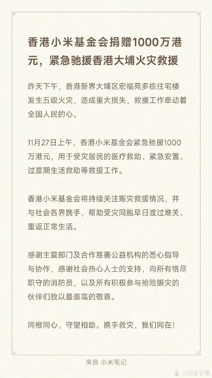 香港小米基金会捐赠1000万港元 企业这时候能站出来其实就已经起到了一些作用,小