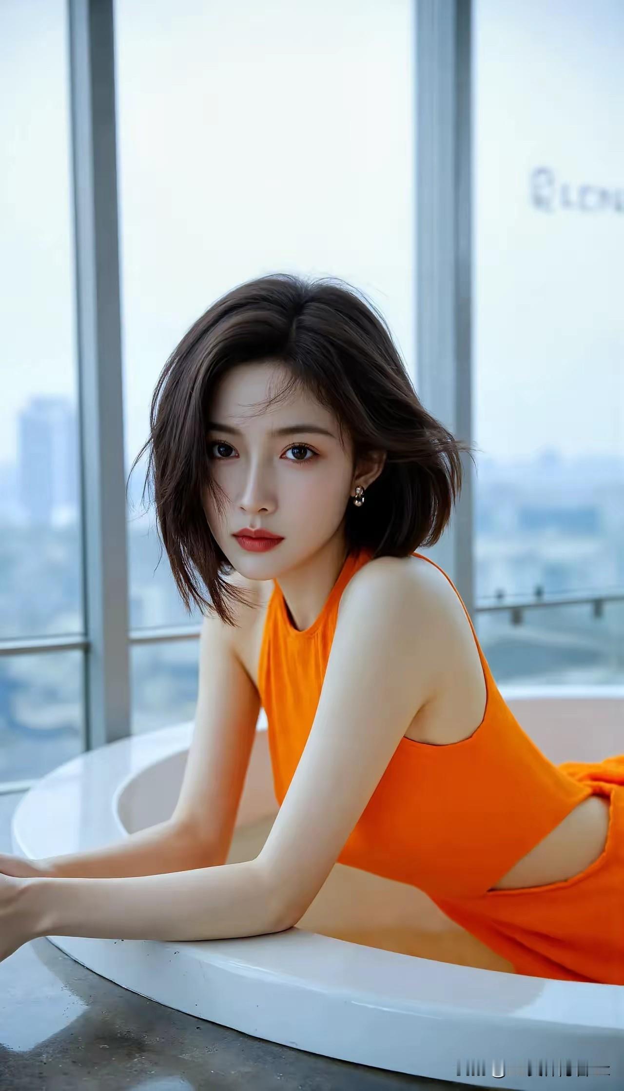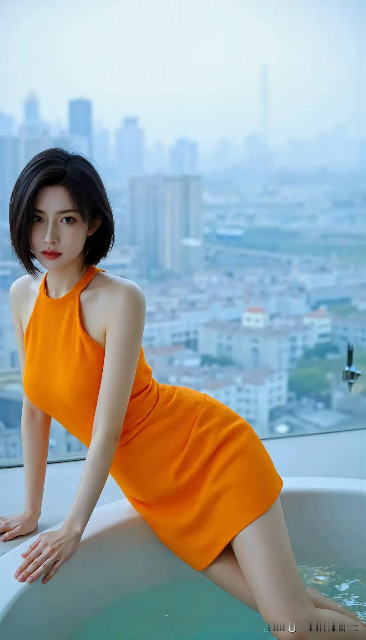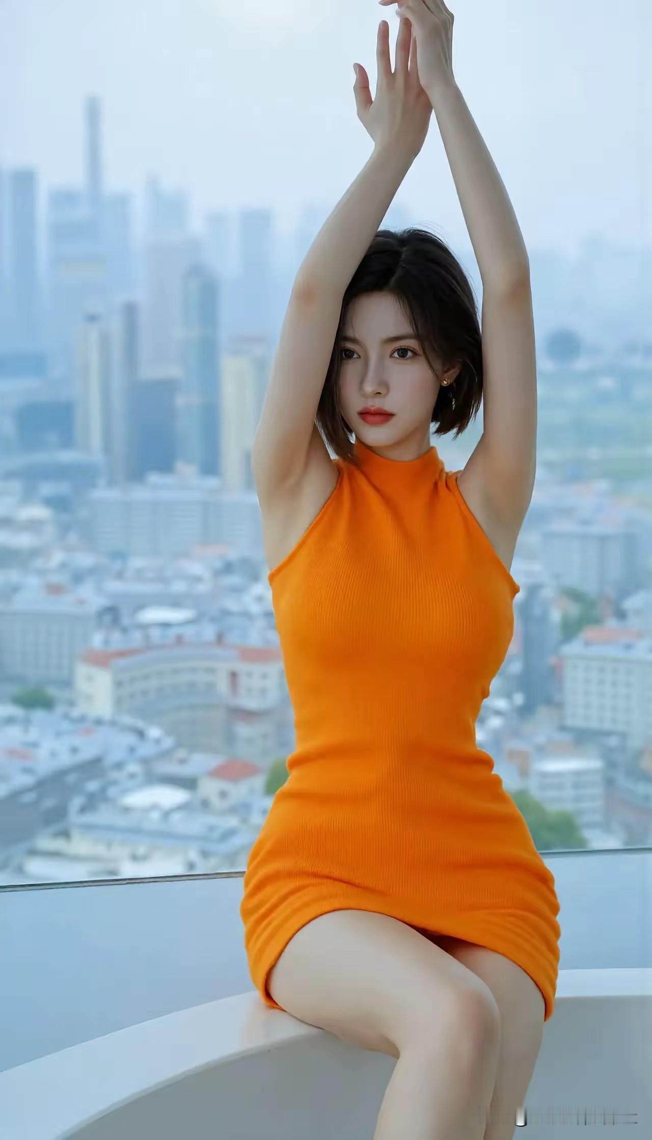 都市丽人穿搭指南:橙色连衣裙+都市天际线背景