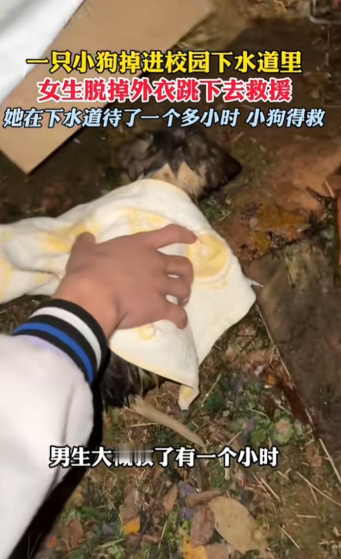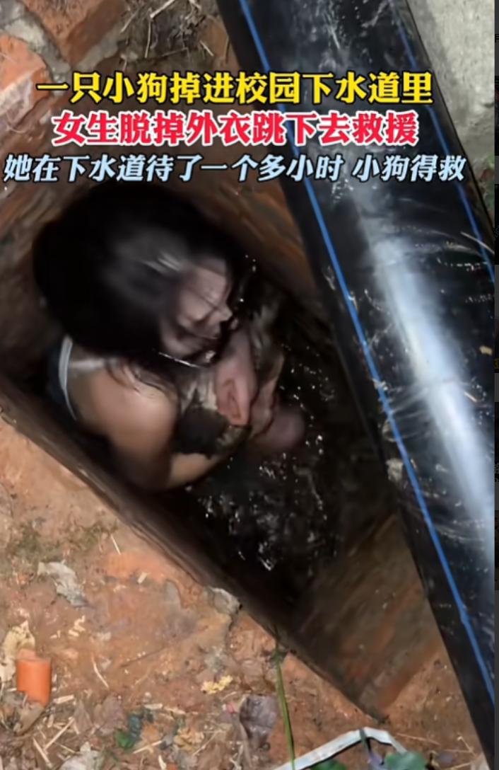 “太有人情味了!”11月21日,湖南常德,一只小狗掉入了狭窄的下水道里面,井口还横着一根较粗的水管,一位女生不顾寒冷的天气,蜷缩着钻入仅容一人通过的洞内,在冰冷泥水中摸索了近一个小时终于救出小狗。网友:寒天里的热乎心。 事情得从当天早自习说起,那只倒霉的小狗不知怎么掉进了下水道,深达 1.5 米的井底又潮又黑,它被困在里面足足四个小时,期间不是没人想帮忙,有人找来树枝试着去够,可井口太窄根本伸不到底,还有人跑去喊保安,可底下漆黑一片,保安也没辙只能暂时放弃。 消息传到那位扎着低马尾的女生耳朵里时,她连午饭都没顾上吃,从宿舍顺手抓了一条旧毛巾,就急匆匆冲到了现场,赶到下水道井口,女生才发现情况比想象中更棘手。 井口本来就小,还横着一根粗水管,仅能容一个人侧身通过,当时天寒地冻,她穿着厚厚的冬衣,试了试根本挤不进去,臃肿的外套还容易被水管棱角勾住。 她盯着井口看了两秒钟,二话没说就把身上的厚外套脱下来,塞进旁边同学手里,其实她也冷,寒风刮得脖领发凉,可她心里就一个念头,多耽误一秒底下的小狗就多受一秒罪,脱了外套蜷着身子,说不定还能往里多钻一寸。 真正的考验是下到下水道之后,刚跳下去冰冷的泥水就瞬间没过了膝盖,刺骨的寒意顺着裤腿往上窜,井底空间狭小,她完全站不起来,只能半趴在泥泞里匍匐前进。 下水道的砖缝又粗糙又锋利,混着碎渣蹭得她头发、脸上全是黑泥,小腿也被磨得生疼,可她压根顾不上这些,所有注意力都集中在双手的触感上。 那只小狗受了惊死死贴在水管和墙壁的死角里发抖,连叫唤的力气都快没了,女生一边忍着寒冷带来的身体颤栗,一边极力放轻动作,用发颤的声音温柔地安抚着,一遍遍说着 “不怕不怕”。 怕自己的动作太急再吓到小狗,就在冰水里维持着极其难受的姿势,用手指一点点去蹭小狗的爪子,耐着性子跟它耗了二十多分钟,前后在暗无天日的井底折腾了近一个小时,她才终于小心翼翼地把小狗揣进了怀里。 当她满身泥污地从井口挪出来时,活脱脱像个泥猴,脖子和胳膊上全是污垢,右手背还划了一道口子,血珠顺着指尖往下渗,围在旁边的同学早就被她的执着打动了,有人赶紧脱下自己的棉袄,裹在她冻得冰凉的身上,有人扶着她,想送她回宿舍换洗。 可这个浑身脏兮兮的女生,第一反应不是喊疼也不是喊冷,而是急切地举起怀里的小狗,满眼焦急地问周围人:“谁有干净的纸巾?” 她怕刚才在黑暗里盲摸的时候,不小心伤到了小狗耷拉着的耳朵。 其实这份下意识的温柔,并不是一时冲动,在学校的车棚里,经常能看到被细心拆开的废纸箱,那是她为流浪猫准备的避雨处,宿管阿姨查房时也留意过,她的柜子里常年备着一小袋幼犬粮,理由简单又让人动容:“万一碰到流浪的小狗,能喂两口是两口。” 第二天女生带着小狗去了宠物医院,体检单显示小家伙除了轻微受凉没什么大碍,当时她嘴角还沾着给小狗洗澡时蹭上的沐浴露泡沫,手里攥着体检单笑得特别灿烂,全然忘了前一天在寒风中钻进下水道,在泥水里冻得打摆子的背影有多让人心疼。 后来有人夸她勇敢,她反而挠挠头不好意思地说:“那时候就觉得小家伙在底下肯定慌坏了,没什么别的想法,就是不忍心看着它遭罪。” 初冬的常德虽然寒冷,但这位女生的举动,却像一束暖阳照进了每个人心里,一只被困的小狗,一个狭窄的井口,一段冰冷的泥水路程,她用近一个小时的坚持,诠释了什么是最朴素的善良。 网友们说的 “寒天里的热乎心”,大概就是这样吧,无关轰轰烈烈,只是在别人需要的时候,愿意放下顾虑伸出援手,用自己的温暖驱散寒冷与无助,这份人情味不仅救了一只小狗的命,也让这个冬天变得格外温暖。 (信息来源:《小狗掉进下水道,女生寒冷天脱去外衣跳下去救援》发现大连)