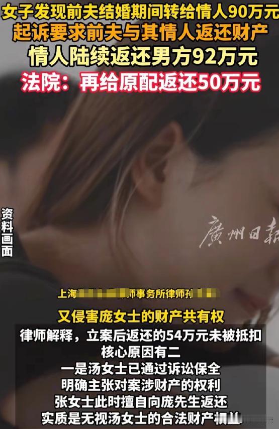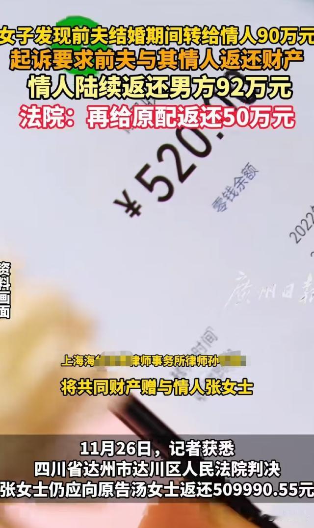 四川达州,汤女士离婚后发现前夫庞先生婚内出轨,长期背着她在婚内给情人张女士转账,累计转走896995.55元夫妻共同财产,汤女士一气之下把前夫和情人告上法庭,要求认定赠与无效并退还财产,张女士得知后,陆续给庞先生转了92.7万,以为能还清债务,结果法院判决她再给汤女士还51万,汤女士觉得这买卖亏大了。 汤女士和庞先生,于2007年登记结婚,本以为美好的婚姻,最终以离婚告终。 离婚后,汤女士发现,庞先生早背着她在婚内和张女士就有了不正当的关系,还通过多种方式给张女士转账,累计达896995.55元。 有些转账的数字寓意特殊,备注也肉麻,而庞先生从未给过汤女士这些浪漫。 汤女士和庞先生结婚后,汤女士一心操持家务,照顾家庭,可庞先生却背着她在外面有了别的女人,这个人就是张女士。 庞先生和张女士在一起后,为了讨张女士欢心,频繁地给她转账。 那些转账数字,像520、1314之类的,寓意特殊得很,备注也是肉麻兮兮的。 汤女士一直被蒙在鼓里,直到离婚后,偶然间发现了庞先生的这些转账记录。 这一发现,让汤女士怎么也没想到,自己辛苦为这个家付出,庞先生却在外面和别的女人卿卿我我,还把大把的夫妻共同财产转给对方。 汤女士觉得庞先生侵犯了自己的财产权益,他的行为,也违背了公序良俗。 汤女士决定不能就这么算了,她把前夫庞先生和张女士直接给起诉了,要求认定庞先生给张女士的赠与无效,并且让张女士退还这些财产。 张女士收到传票时,慌了神。 她没想到事会闹到这个地步,她想着要是能把钱还上,说不定就能免了这场官司。 于是,在立案前后,张女士陆续给庞先生转了92.7万。 她以为这样就能把事情解决了,可没想到事情远没有她想的那么简单。 那么,庞先生给张女士的转账是否有效,张女士已经转给庞先生的钱能不能抵扣,以及她是否还需要再还钱呢? 汤女士认为: 庞先生在婚内擅自把夫妻共同财产转给张女士,这是严重侵犯自己权益的行为,而且这种行为违背了公序良俗,所以这些转账应该是无效的,张女士必须全额退还。 张女士觉得: 自己已经转了92.7万给庞先生,这钱应该能抵扣大部分债务了。 她觉得汤女士不应该再揪着不放,毕竟自己已经做出了弥补。 庞先生在整个过程中,一直沉默不语。 他知道自己理亏,也不敢多说什么。 他心里可能也在后悔自己的所作所为,可现在事情已经到了这一步,他也无力回天。 从法律看: 这涉及到夫妻共同财产的处理和赠与合同的效力。 民法典规定,夫妻在婚姻关系存续期间所得的财产,为夫妻的共同财产,归夫妻共同所有,夫妻对共同财产,有平等的处理权。 庞先生和汤女士婚姻关系存续期间,庞先生赚的钱都属于夫妻共同财产。 他未经汤女士同意,擅自把这么多钱转给张女士,这明显侵犯了汤女士对夫妻共同财产的平等处理权。 民法典规定,违背公序良俗的民事法律行为无效。 庞先生婚内出轨,还把夫妻共同财产赠与情人,这种行为严重违背了公序良俗,所以他和张女士之间的赠与合同是无效的。 那么,张女士转给庞先生的92.7万,能不能全部抵扣债务呢? 这需要分情况,张女士在立案前转的38.7万,因为是在法院介入之前,庞先生接收这笔钱可以视为是对债务的一种部分偿还,所以这38.7万可以抵扣。 但是,立案后张女士转的54万就不一样了。 庞先生在这时候接收这笔钱,没有履行对汤女士的义务,也没有和汤女士商量财产处理的问题。 而且张女士转这笔钱,有掩盖事实、逃避法律责任的嫌疑。 所以,这54万的还款,应该认定为无效。 综合以上情况,法院最终判决张女士再给汤女士还51万。 有人认为,张女士也挺冤的,她以为还了钱就能没事了。 可她不知道,法律对于这种违背公序良俗的行为,是有严格规定的。 要是张女士在转账的时候,和庞先生签订了协议,说明这些钱是用于偿还债务,这样能避免法院认定还款无效吗? 根据民法典规定,即使签订了这样的协议,如果协议本身是为了掩盖非法目的,这样的协议也是无效的。 所以张女士即使签订了协议,也不能改变最终的判决结果。 庞先生在这个过程中,就没有一点责任吗? 庞先生作为侵权人,他擅自处分夫妻共同财产,不仅要承担对汤女士的赔偿责任,还因为婚内出轨等行为,在离婚时对财产分割产生不利影响。 【信息来源: 男子婚内转情人89.7万元,情人陆续返还男子92.7万元,四川一法院:情人仍需向原配返还近51万元 2025-11-27 11:39·九派快讯】