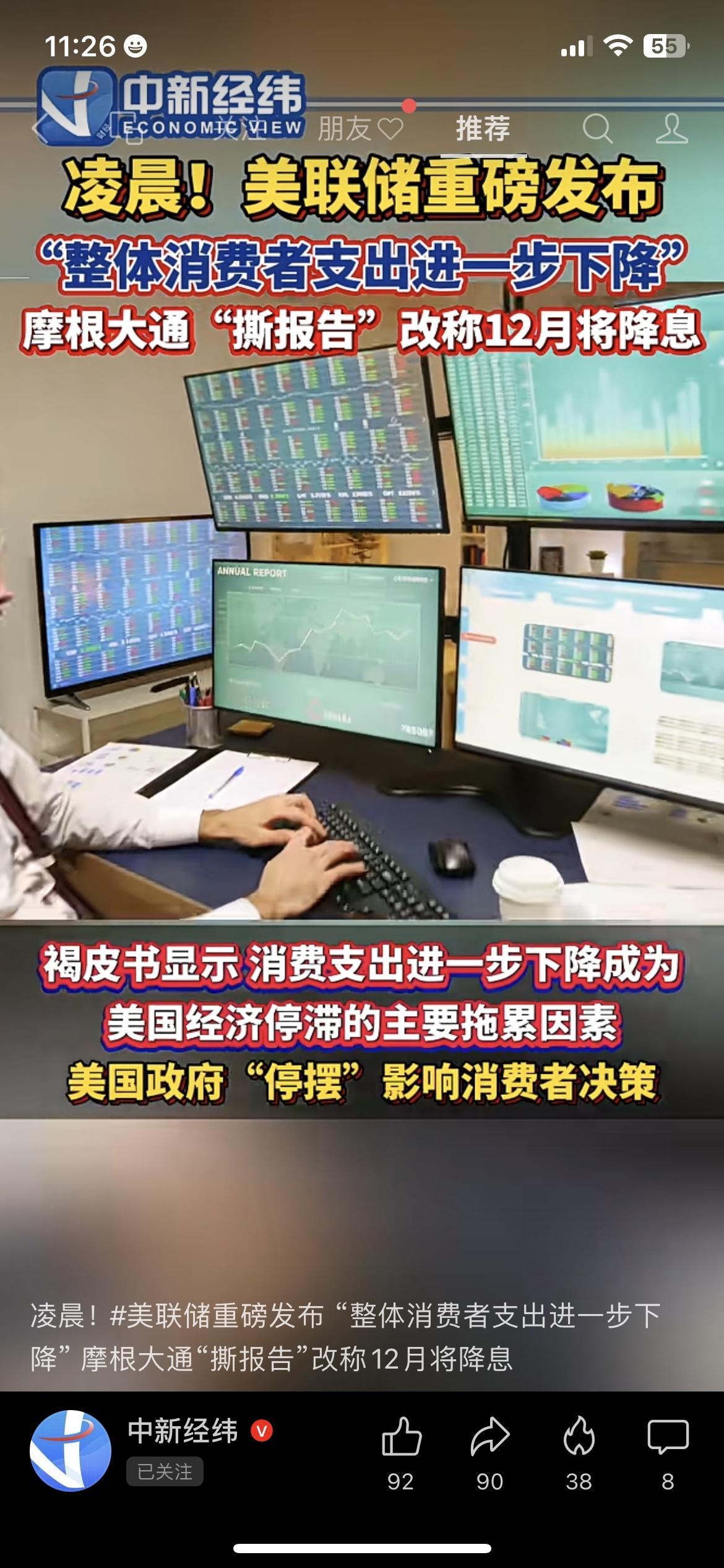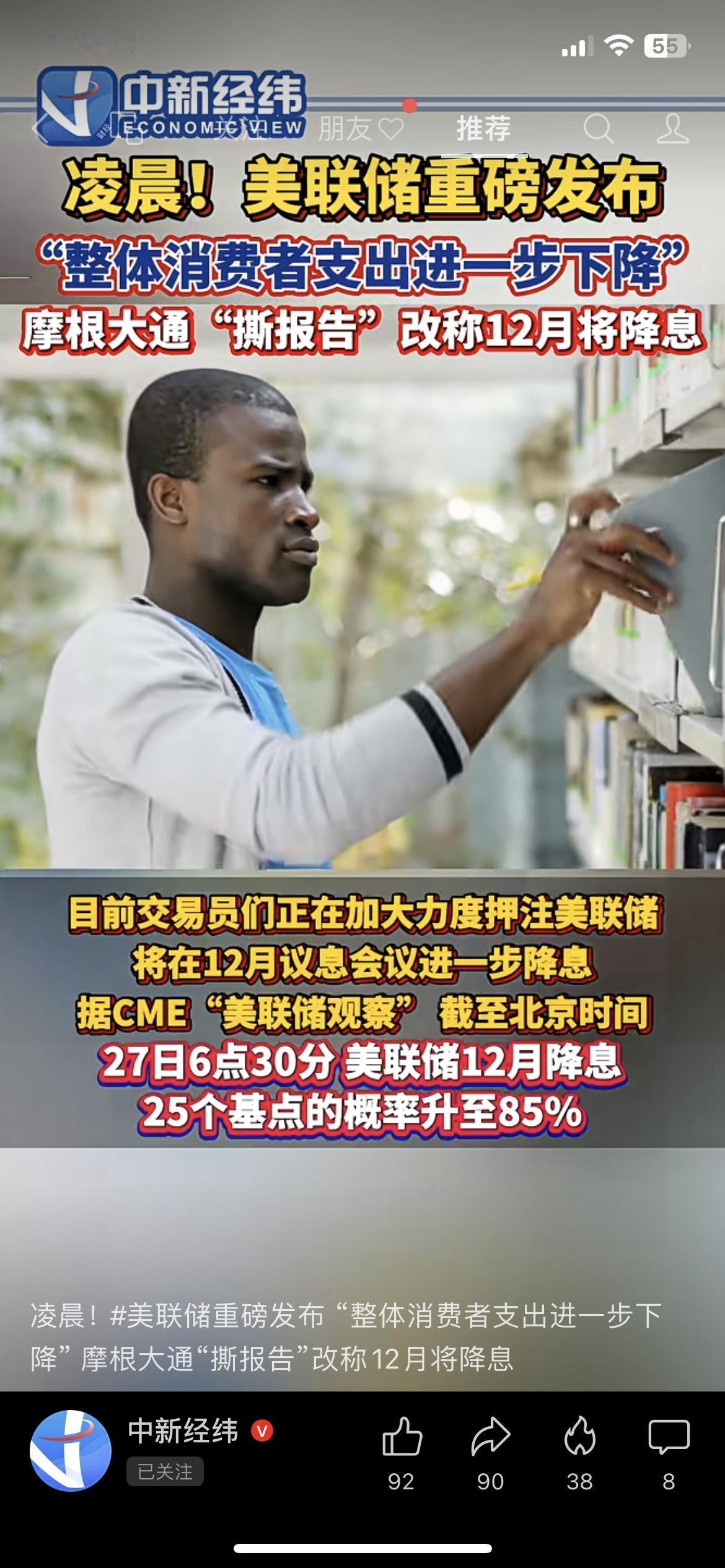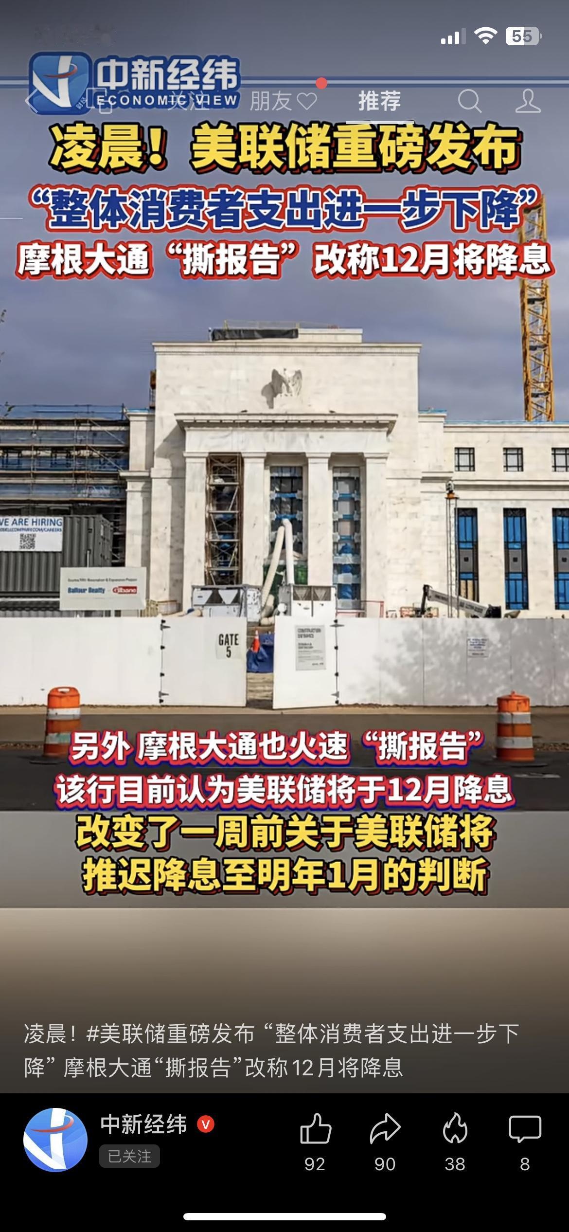 凌晨这波财经消息直接给我看懵了!美联储刚放话‘美国人最近花钱更少了’,摩根大通转头就把自己上周的报告‘撕了’——上周还说美联储得拖到明年1月才降息,现在直接改口‘12月就降’! 交易员们都疯抢押注了,现在赌12月降息25个基点的概率都干到85%了! 说到底还是美国经济绷不住了:老百姓不消费,政府还停摆,这不降息刺激下,估计更凉。 就等12月美联储议息会给准信了,这波操作连咱们钱包都得跟着晃一晃,蹲个后续!”美联储降不降息 美联储利率决定 美联储