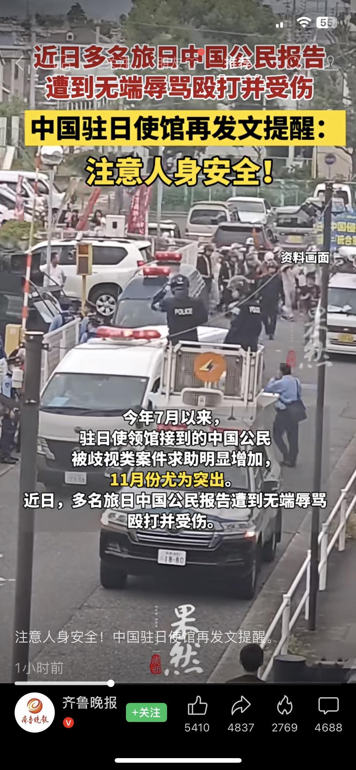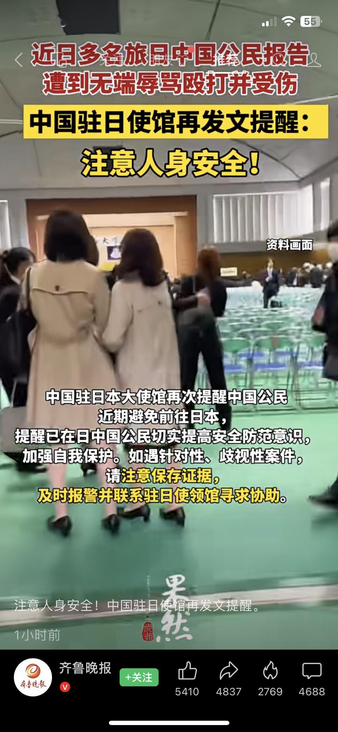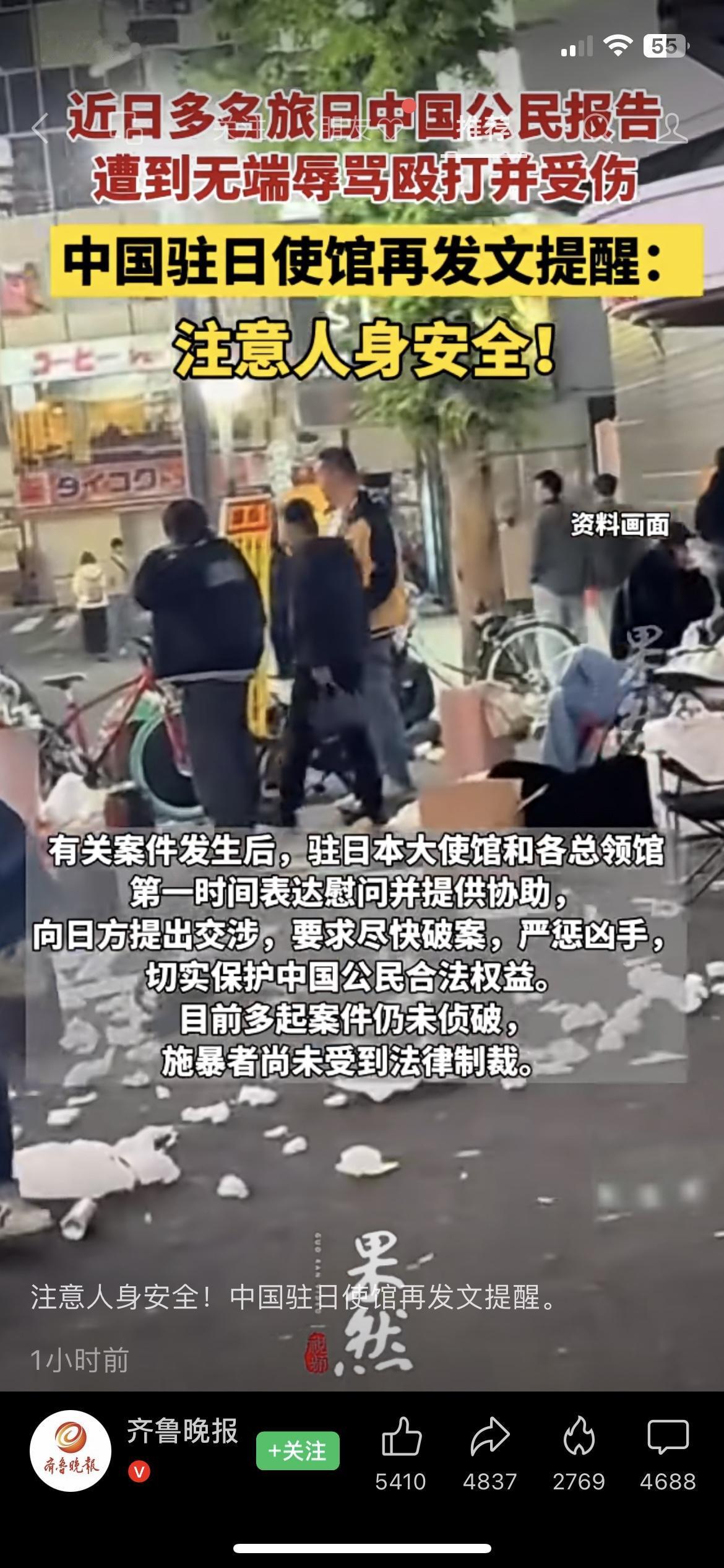 刚刷到驻日使馆发布的新提醒,看完心里憋闷得难受——这几天有好几位前往日本的同胞,什么都没做就遭人辱骂、殴打,还受了伤! 使馆直言“近期别去日本”,在日本的朋友们可得多留意:要是碰到针对咱们的事情,别硬拼,先保护好自己,接着赶快拍下证据、报警,并第一时间联系使领馆寻求帮助! 而且日本的治安状况真的大不如前了:2021年到2024年,犯罪案件从56万多起增加到73万多起,杀人、抢劫这类重罪更是直接增长了65%!以前总以为日本很安全,如今看来真是让人提心吊胆。 出门在外,平安比什么都重要,咱们同胞都要保护好自己! 中国驻日本