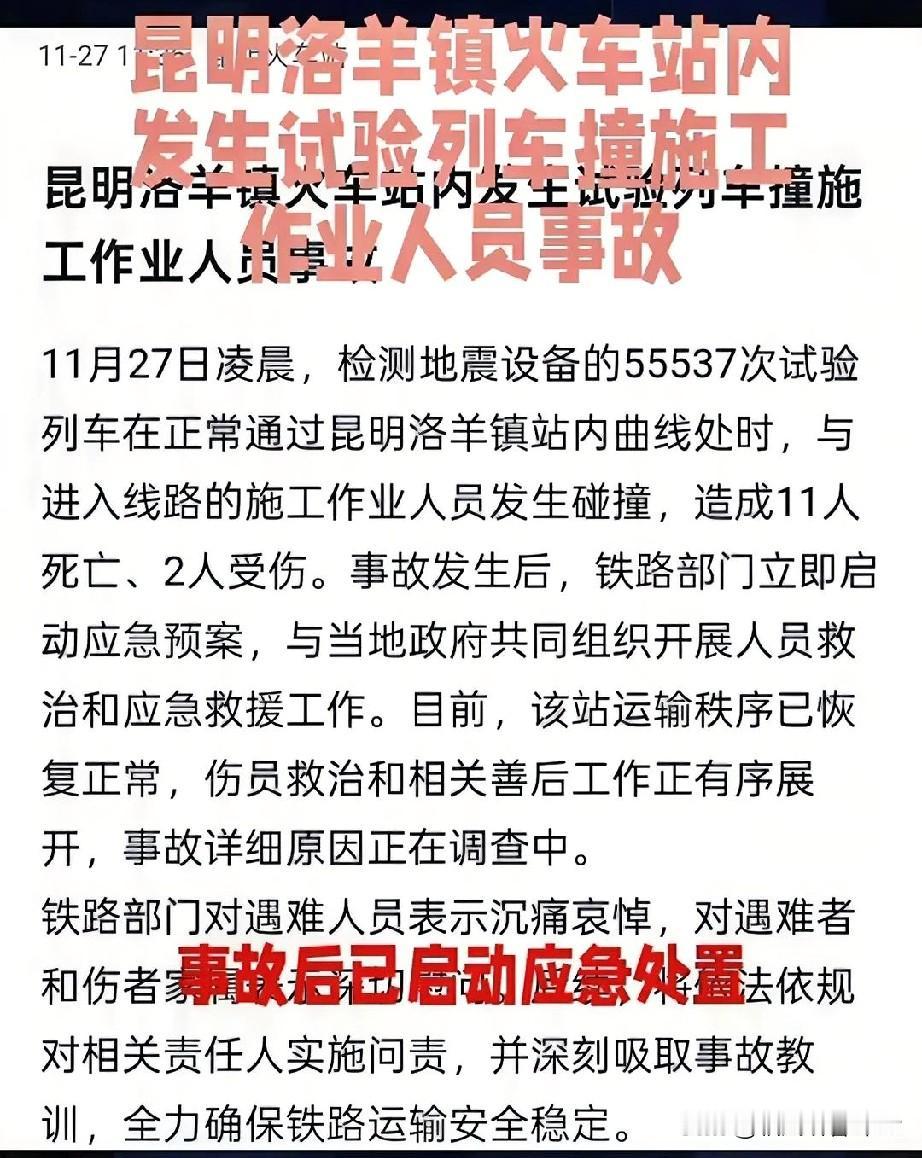 11条鲜活生命凌晨消逝在铁轨上!11月27日凌晨,昆明洛羊镇火车站内的一声碰撞,让检测地震设备的55537次试验列车,成为11个家庭永远的伤痛 。 这列正常通行的试验列车在站内曲线处,与进入线路的施工作业人员正面相撞,最终造成11人死亡、2人受伤的重大安全事故,网传列车碰撞时速度达114km/h 。 洛羊镇站隶属中国铁路昆明局集团,是昆明枢纽核心站点,连接多条高铁干线,此次事故涉事施工为有计划换轨作业,疑似作业人员未收到调度命令提前上道引发 。 事故发生后,铁路部门紧急启动应急预案,联合当地政府开展救治与善后,目前车站运输秩序已恢复,相关责任人问责程序将依法依规推进 。 铁路“天窗修”制度明确禁止非窗口期违规上道,层层安全防线为何失效?11条逝去的生命,该如何敲响安全生产的警钟?欢迎在评论区留下你的看法。