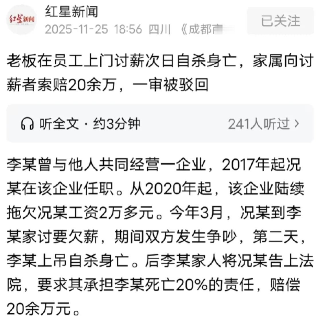 湖南永州,老板欠员工20000块工钱, 5年了都不还,员工按耐不住,上老板家讨工钱,两人因此大吵一架,员工工钱还是没拿到手,谁料,老板想不开,次日竟上吊身亡,家属悲痛欲绝,认为老板的死是员工上门私闯民宅讨薪造成的,告上法庭,向员工索赔21万余元,员工懵了,之后甩出一堆证据,法院判决亮了。 况某在李某的公司干了七八年,从一开始就跟着李某干,算是实打实的老员工,那时候老板李某挺器重他,让他当领队,况某也踏实肯干,凡事都尽心尽力,宾主之间相处得一直不错。 可谁能想到2020 年公司遭遇经营危机后,一切都变了样,之前每月按时发放的工资,慢慢变成了拖欠的糊涂账,有时候给一点有时候干脆提都不提,况某是个念旧情的人,觉得老板遇到难处不容易,也就没好意思死缠烂打地催要,想着等公司缓过来就好了,可这一等就是整整五年。 五年时间里,况某手里的欠条越积越多,最后算下来,老板一共欠了他两万块工钱,这两万块对老板来说可能不算什么,但对况某来说却是要用来给家里老人买药、给孩子交学费的救命钱,眼看着老板不仅对还钱的事只字不提,甚至开始故意躲着他,况某实在没办法再 “通情达理” 下去了。 2025 年 3 月 2 日,天阴沉沉的压得人心里发闷,况某揣着一肚子的委屈和无奈,直接找到了老板李某的家门口,这一次他没打算再让步,进门就要求老板给个明确的说法,什么时候能把欠的工钱还了。 积压了五年的不满一下子爆发出来,两人吵得不可开交,声音大得穿透了门板,引得左邻右舍都纷纷出来看热闹,屋里的气氛紧张到了极点,桌上的水杯都被不小心碰翻,水渍洒了一地。 况某看着老板毫无还钱的意思,还态度强硬,心里又气又急,最后实在没办法,只能自己报了警,民警赶到后一边劝解一边给两人普法,费了半个多小时的功夫,才让双方的情绪平复下来,约定之后冷静处理这件事,况某这才带着一肚子火气和失望离开了。 可谁也没料到这竟是况某和老板的最后一次见面,第二天清晨,李某的家人发现,李某在自家阳台结束了自己的生命,现场还留着没喝完的药物。 突如其来的噩耗让家属悲痛欲绝,他们把所有的怒火都撒到了况某身上,认定是况某前一天 “私闯民宅” 上门讨薪,还跟李某激烈争吵,才把人逼上了绝路,悲痛之下家属一纸诉状把况某告到了冷水滩区人民法院,要求他承担 20% 的死亡责任,索赔 214422.8 元。 刚丢了工作又突然背上了 “命案” 官司,况某坐在被告席上整个人都懵了,他怎么也想不通,自己只是上门要回本该属于自己的血汗钱,全程没有跟老板发生任何肢体冲突,就连警察来了也只是调解,怎么就成了逼死老板的 “凶手”? 好在法律讲究的是证据,不是一时的情绪,为了证明自己的清白,况某翻箱倒柜找出了之前和老板的通话录音,录音里老板早就流露出过 “活着没意思” 的消极念头,更关键的证据来自医院,李某的病历上明明白白写着,他做过脑梗手术,还伴有长期严重的抑郁症。 这些证据都清晰地表明,李某的心理状态一直很脆弱,他走向绝路是长期病痛折磨和心理崩溃的结果,并不是因为那一场讨薪的争吵,法院经过详细调查和审理,最终理清了事情的来龙去脉。 法官认为欠债还钱本就是天经地义的事,《劳动法》赋予了员工追讨劳动报酬的合法权利,况某上门和老板协商讨薪,属于正常的私力救济,并不算什么 “私闯民宅”。 而李某作为一个有完全民事行为能力的成年人,他选择自杀虽然让人惋惜,但这是他自身抑郁病情和个人选择导致的结果,把这种极端后果强加给正当维权的讨薪者,既没有法律依据,也不符合公序良俗。 最后法院作出了判决,驳回了死者家属的全部诉讼请求,这个判决不仅给这起荒诞的 “反向索赔” 案画上了句号,也守住了最朴素的道理,不管是谁都不能用自己的不幸去绑架别人的合法权益,哪怕是付出了生命的代价,也不能抹去欠薪理亏的事实,而况某依然可以通过合法途径,从李某的遗产中,追回那本就属于他的两万块血汗钱。 (信息来源:红星新闻)
