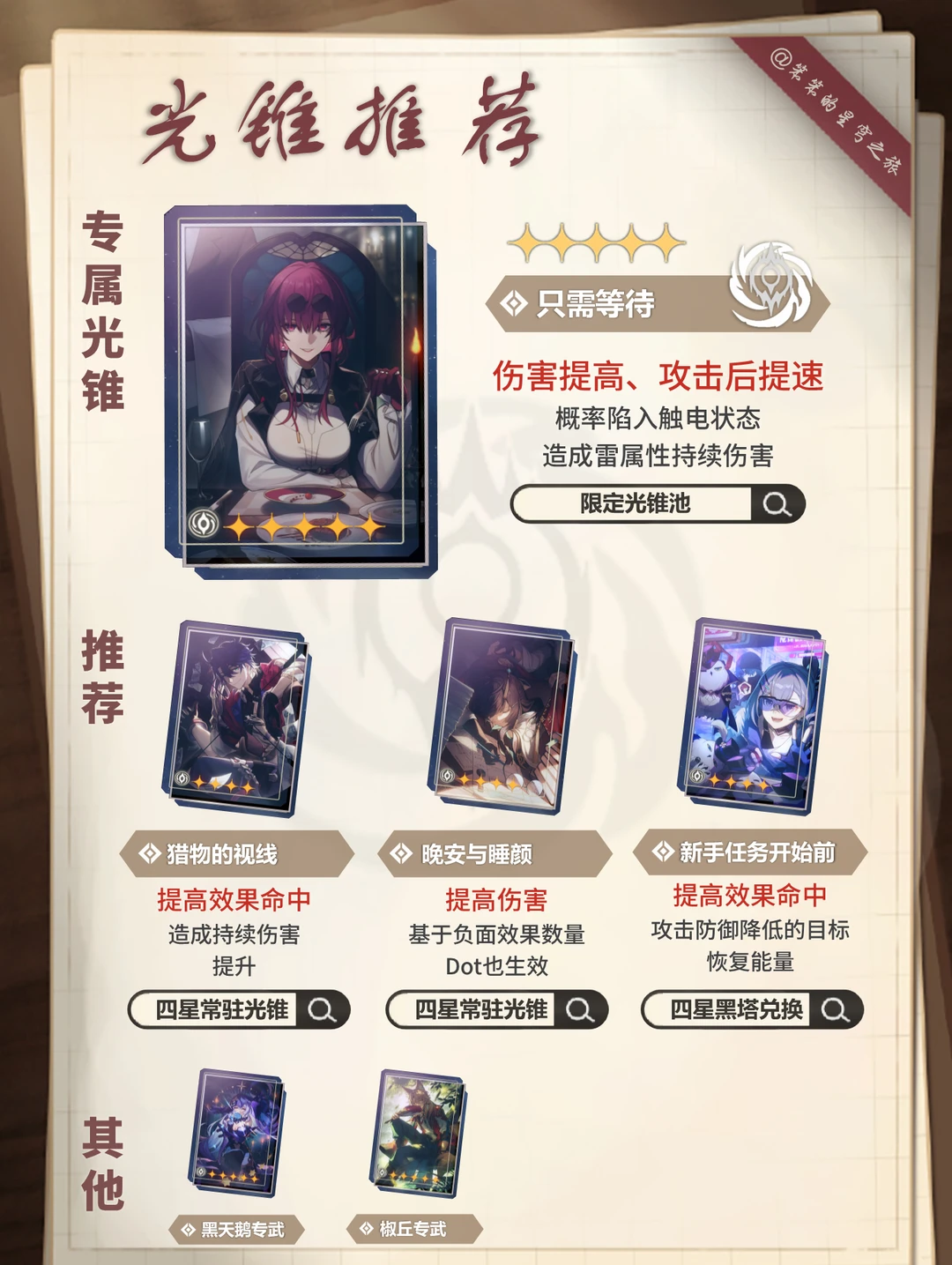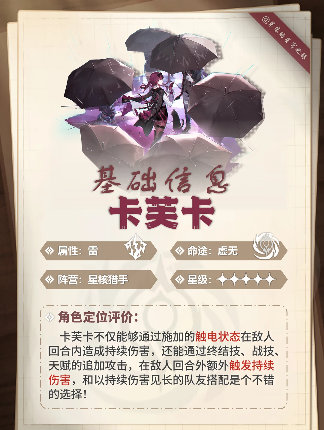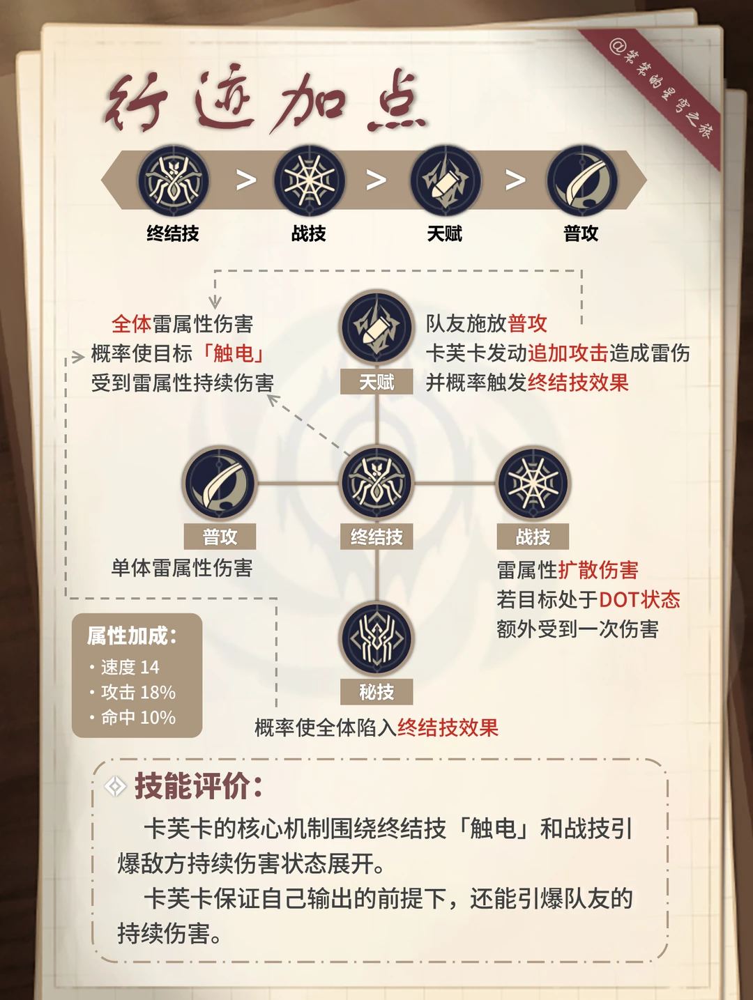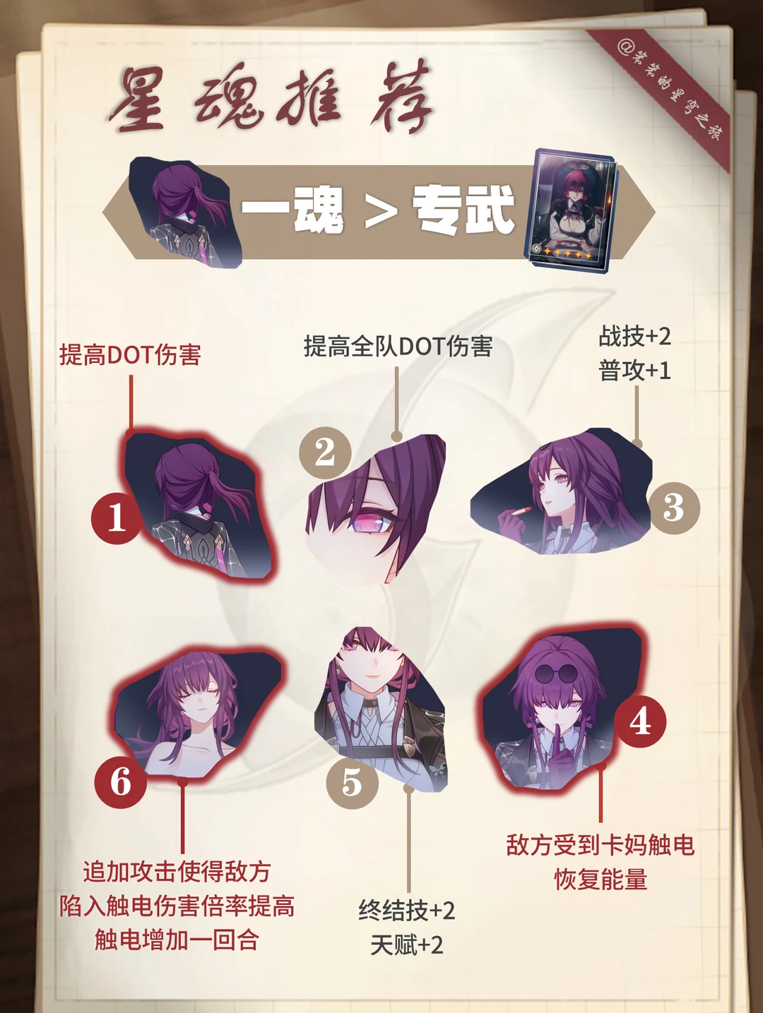 🐱大家好,我是笨笨的铲屎官 卡芙卡加强后攻略来啦 卡妈作为DOT 队核心 核心在大招引爆伤害超猛 遗器加速+充能,加快大招释放 其次再考虑自身的伤害输出 有专武拿专武,没就用「晚安与睡颜」 话说,还有玩家复刻抽卡芙卡吗
