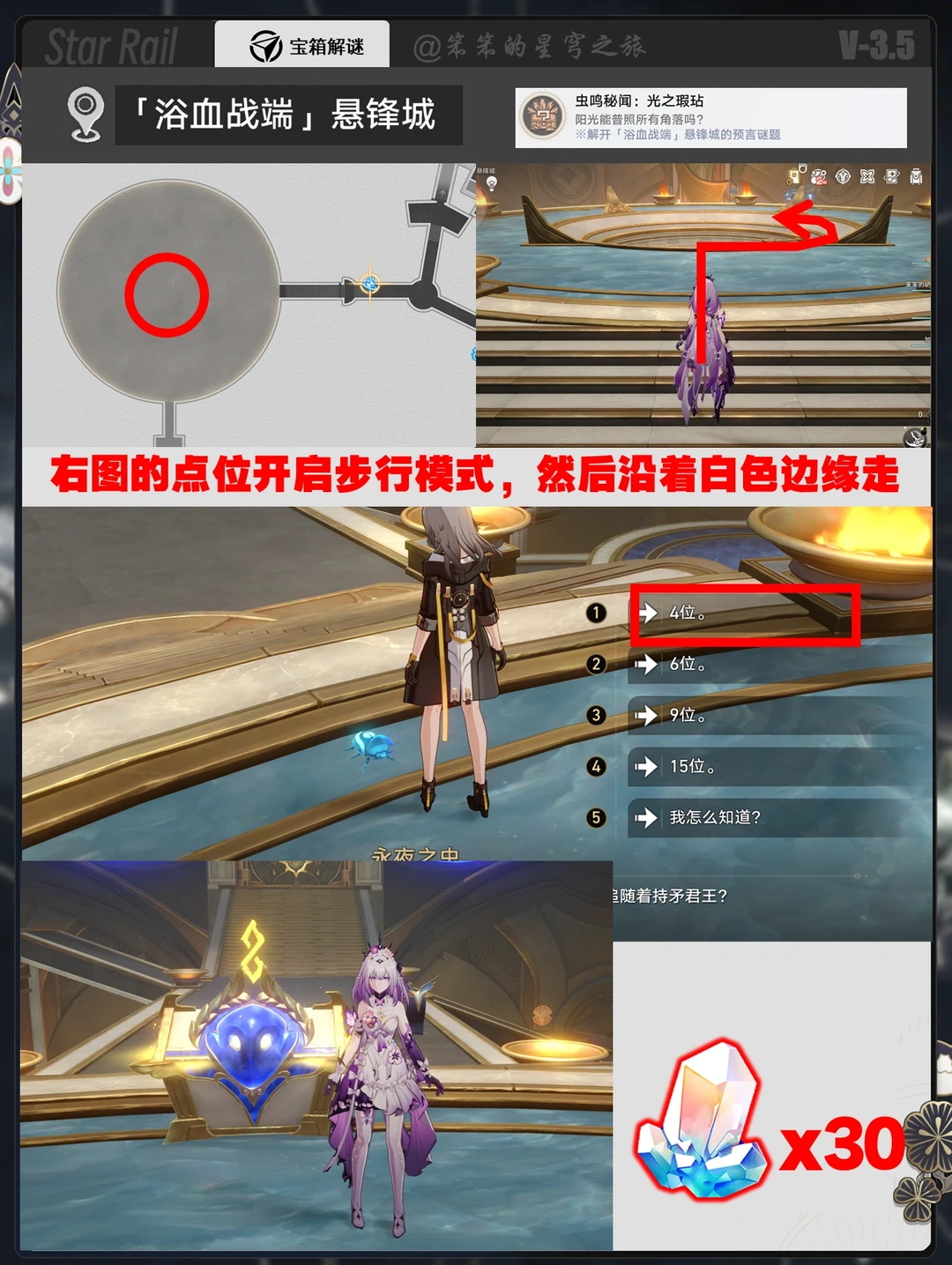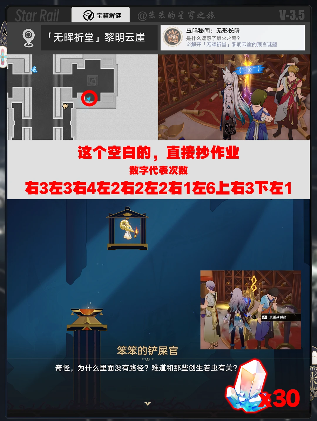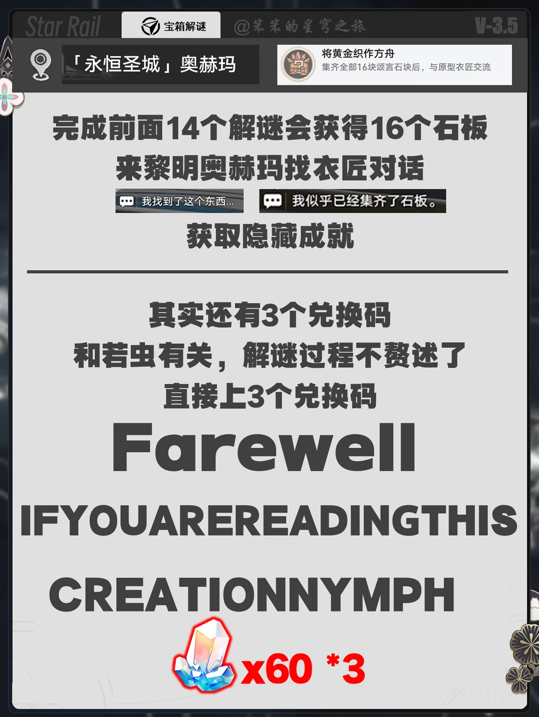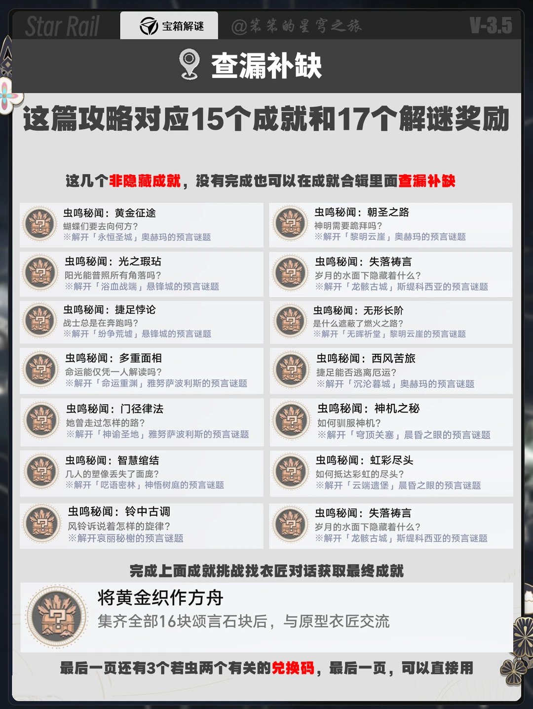 🐱大家好,我是笨笨的铲屎官 给大家整理了3.0-3.5 14个虫鸣秘闻 完成后获取12个石碑 再来到黎明奥赫玛的衣匠处对话 获取第15个成就 其中还有三个单独星琼 可以直接使用 萌新开拓者可以直接抄作业 一次性拿下600多原石 还不快去速速拿下