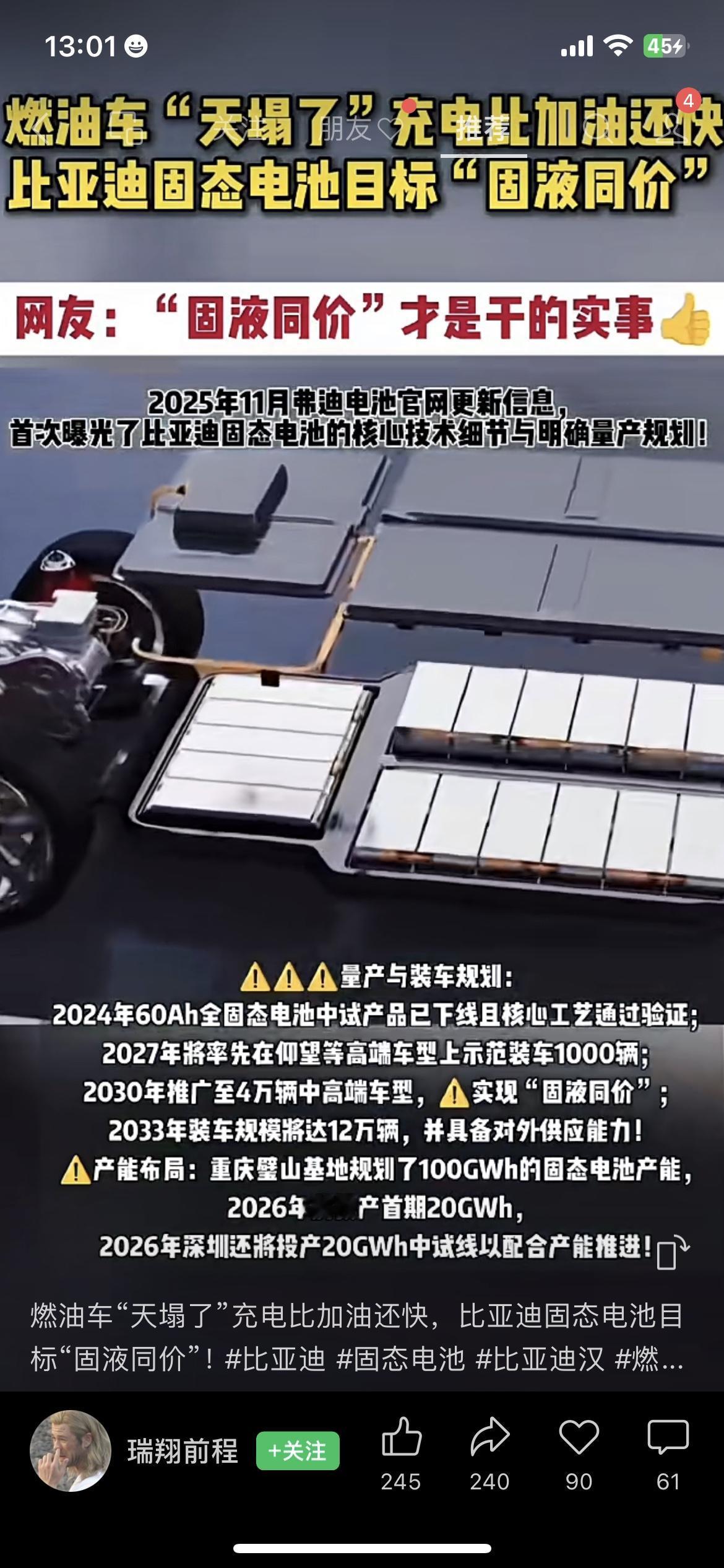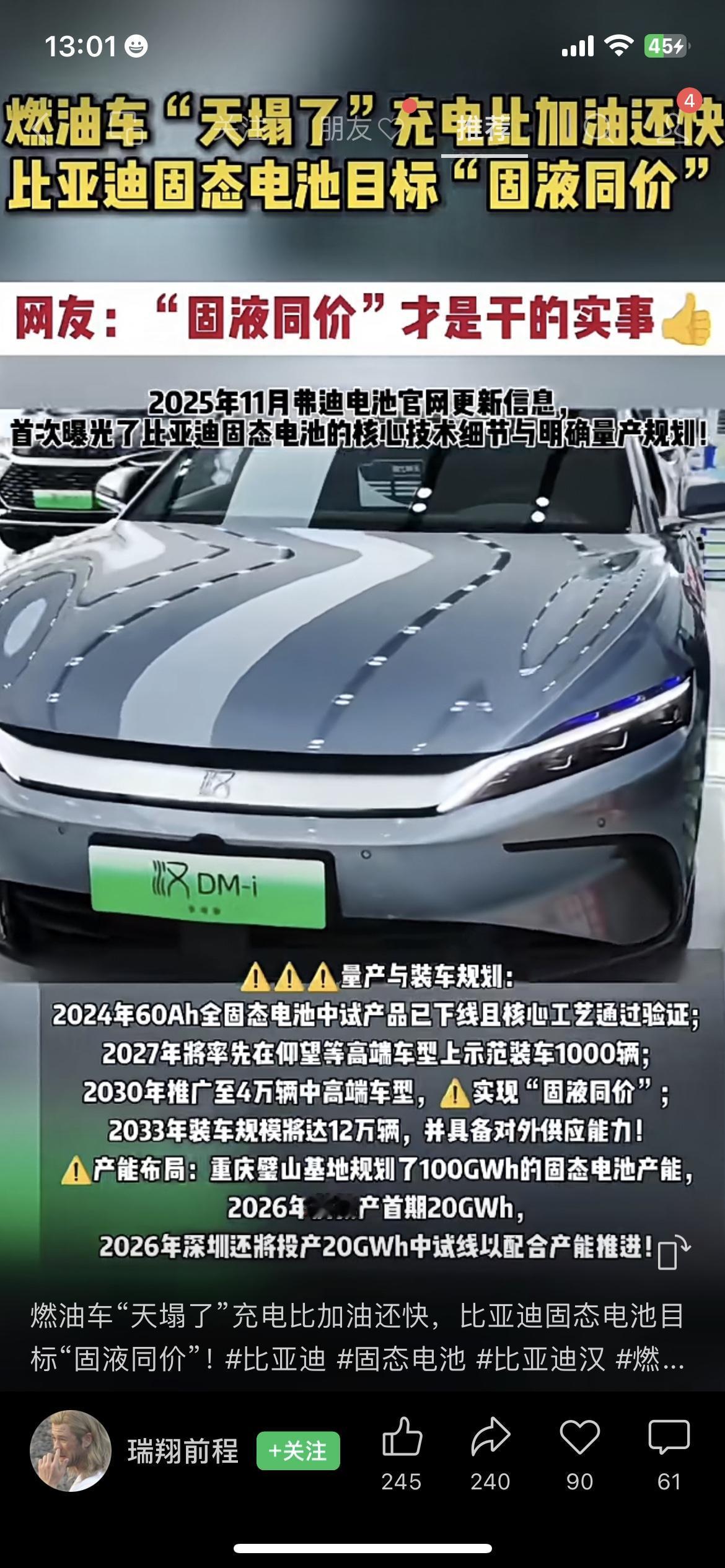 比亚迪这波是把燃油车往“绝路”上推啊!充电比加油快,固态电池还要和液态一个价? 家人们谁懂啊!比亚迪刚放的固态电池消息,直接给我看傻了—— 咱先唠实的:2024年那60Ah全固态电池,中试都做完了,工艺全过关;2027年先给仰望装1000辆试试水,到2030年直接喊出“固液同价”! 啥概念?以后买电车,电池是固态的(不容易烧,安全!),续航轻松破1000公里,充电10分钟就满(比你去加油站排队加油还快),关键是这电池价格,和现在普通液态电池一样! 更狠的是成本:2025年中试阶段就干到1200元/kWh,2027年装车可能压到500元/kWh,重庆璧山直接砸了100GWh的产能,2026年先投20GWh——这哪是卷同行啊,是把燃油车“加油快、续航稳”那点优势全给扬了! 我就想问:这电池真量产了,你们还会考虑买燃油车不?评论区投个票!