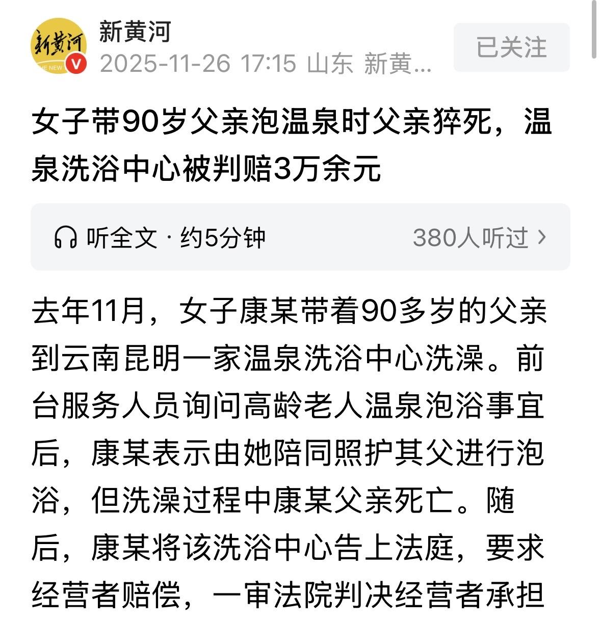 云南昆明,女子带90岁父亲去洗浴中心洗澡,前台告知高龄老人泡浴事宜后,女子表示她会跟着父亲进入浴池,全程陪同,没想到,老人泡澡期间,竟突然猝死在池中,家属把洗浴中心告上法院,索赔死亡赔偿金等等…然而,法院判决让双方都无法接受。 2024年11月23号下午,康家父女俩走进一家温泉洗浴中心。 前台姑娘看有老人,就问老爷子多大岁数了?女儿康某回说90岁。 由于店里规定,高龄老人必须有人陪同,所以姑娘又问康某:您全程陪着泡吧?康某点头说“是”,接着扫了120块钱付了两个人的票钱。 父女俩被领进浴池区时,康某伸手试了试池水,转头对父亲说:水温刚好,比家里澡盆舒服。 康某扶着老人慢慢下台阶,池子里雾气腾腾,老人下去后也泡得惬意。 可谁也没料到,这趟本该放松的泡汤,会成了老父亲生命的最后一程。 泡了不到10分钟,突然传来一声闷响。康某抬头一看,父亲整个人倒在水里,双手扑腾着乱抓。 她慌得大喊:救人啊!远处的工作人员听到动静跑过来,七手八脚把老人抬上岸,并连忙拨了120。 救护车来的时候,康某父亲的脸已经发紫。医护人员轮流按压胸口,可终究没能把老人拉回来。 公安的人来现场看了,说没外力伤害,是自然死亡。 可康某看着父亲冰冷的身体,伤心欲绝,明明自己全程陪着,父亲怎么能说走就走了? 事后,康家把温泉中心告了,要讨个说法。 法庭上,温泉老板直喊冤,说我们挂了警示牌,写了‘高龄老人需陪同’,还配了急救箱,当天也确认了儿子跟着,怎么还怪我们? 然而,温泉店被查出来的问题也不少。 这家店用的是别人家的消防许可证,自己压根没过消防检查。商务部的温泉行业标准里写着水温不能超42℃,可当天池水实测46.8℃,对91岁的老人来说,这温度实在太危险。 法官审理认为,老人自己该知道高龄泡温泉的风险,女儿陪着也没及时察觉异常,这主责得自己担。 但是,温泉中心无证经营是硬伤,消防不过关、水温超标,这些都是安全隐患。 最终,法院判决温泉中心赔3万6,占两成责任。 温泉中心不服,提起上诉。 有人认为,一码归一码,消防不过关,应该由相关部门来处罚,这个消防不过关,不是老头猝死的原因。 即使是年轻人也有猝死的可能,如果凡是进商场购物,进影院看电影,或进游乐园玩等,一旦不幸死亡,照上例案件,是否都要赔偿? 所有经营场所,包括医院,对高龄的人都应该慎重,最好是拒收。对经营者来说,风险太高,往往都是吃力不讨好,还得倒贴钱。 那么,从法律角度,怎么看待这件事? 《民法典》第1198条规定:宾馆、商场、银行、车站、机场、体育场馆、娱乐场所等经营场所、公共场所的经营者、管理者,未尽到安全保障义务,造成他人损害的,应当承担侵权责任。 温泉洗浴中心作为公共经营场所,对顾客的人身安全负有法定保障义务。这种义务不仅包括场所内的设施安全,还包括对特殊人群,如高龄老人的特殊风险防控。 根据《消防法》,温泉中心未取得消防救援机构许可即擅自营业,属于“未取得合法经营资质”的重大安全隐患,直接违反安全保障义务的基础要求。 商务部行业标准规定温泉水温不得超过42℃,但事发时池水温度达46.8℃,高温环境加剧了91岁老人的心脏负担,属于“设施不符合安全规范”的过失。 温泉中心虽配备急救设施,但没有在老人突发状况时采取更有效措施,如及时送医,反映出应急流程的不足。 法院认定老人自身承担80%主责,是因高龄泡温泉属高风险行为,其本人及家属应预判风险。 洗浴中心承担次责20%,是因其未履行“全面合理限度内的安全保障义务”这些因素构成了损害后果的原因力之一。 通俗点说,就像去澡堂子泡澡,老板得先确保池子不烫脚、地板不滑、消防通道畅通。 这起案子里,澡堂老板没办消防证就开门迎客,池水还烧得比规定温度高,结果91岁的老爷子泡出事了。 这法条就是告诉所有开店的老板:开门做生意,安全得放在第一位,该办的证、该守的规矩,一样都不能少。 二审时,老板还是不服气,可法院还是维持了原判。 不过,也有人认为,这不是人身伤害,是自然规律,本人、女儿、洗浴中心都没有责任。洗浴中心的不合规问题,和死亡发生没有因果关系,本人及女儿更没有过错,老年人洗澡是生活的一部分,不能因为有风险而放弃。 客观的评价,这种案子还是由陪审团判决比较合情合理,随机找10个不认识不相关的人,组成陪审团,然控辨双方申诉和辩论,最后由陪审团判断过错责任,按照少数服从多数原则,陪审团过半人判定有责任或者无责。双方也心服口服。 对此,你怎么看? 关注@运良说法. 学法律知识不迷路