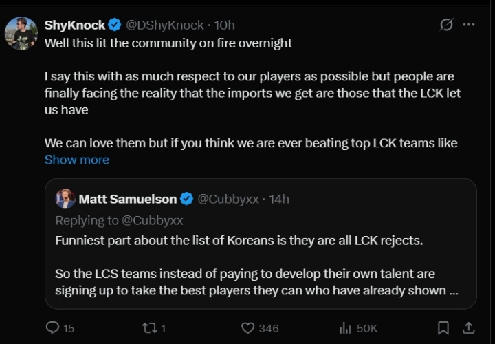 对此博主回应:这事一夜之间引爆了整个社区。我这么说绝无冒犯之意,但我想说的是,我们能引进的外援都是LCK允许我们引进的。我们可以喜欢他们,但如果你认为我们能击败LCK的顶级战队,那就大错特错了。