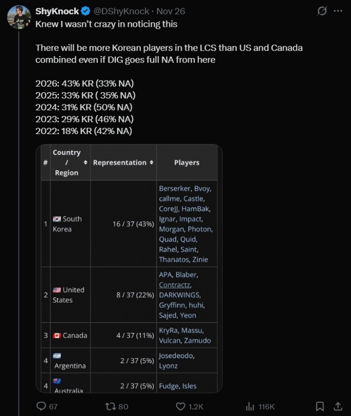 直播吧11月27日讯昨日外媒记者ShyKnock表现发现了问题,明年LCS赛区韩国选后超过美国、加拿大选手总和,并且是逐年增加的趋势,从22年的18%,到26年占比43%。