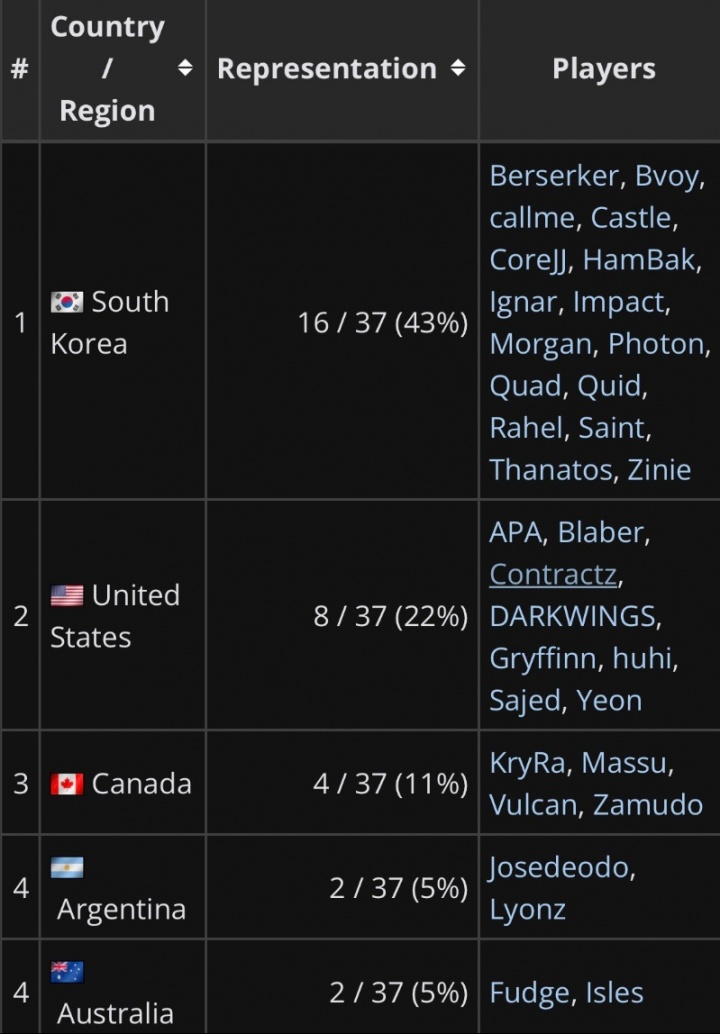 值得一提的是,该博主的美国选手一栏中,Hhi、Yeon为韩裔,Blaber、Darkwings为华裔、Gryffinn为越南裔。