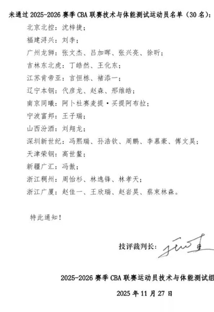 “本次CBA体测共有三十名运动员未通过,需要补测。