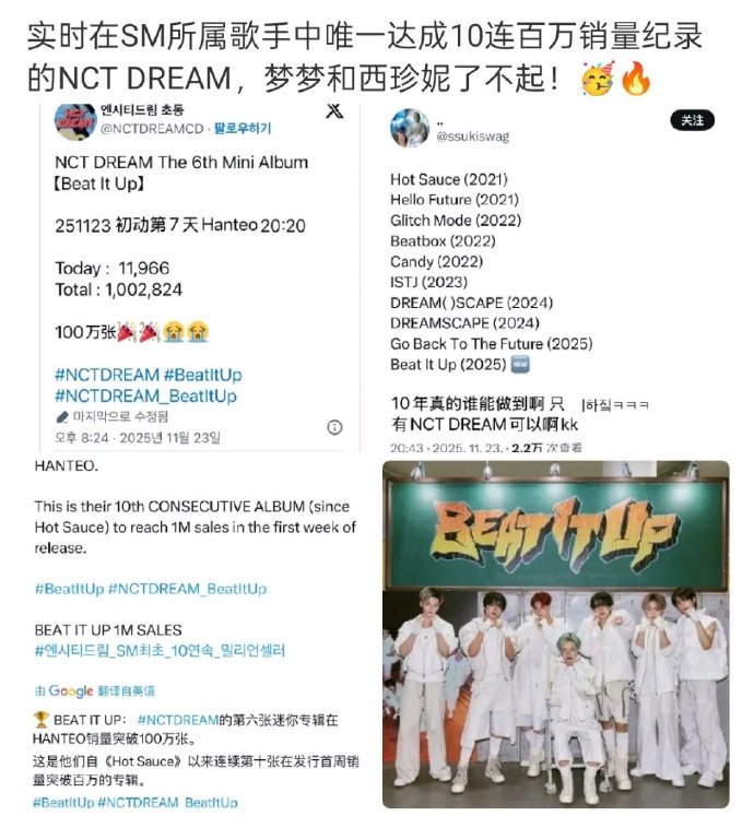 kpop连续10张专辑突破百万销量的男团 地租也太能打了吧!迷你6辑首周就破百万,直接解锁连续十张专辑百万成就,实力真的没得说~榜单和音源都拿下了,不愧是NCT DREAM