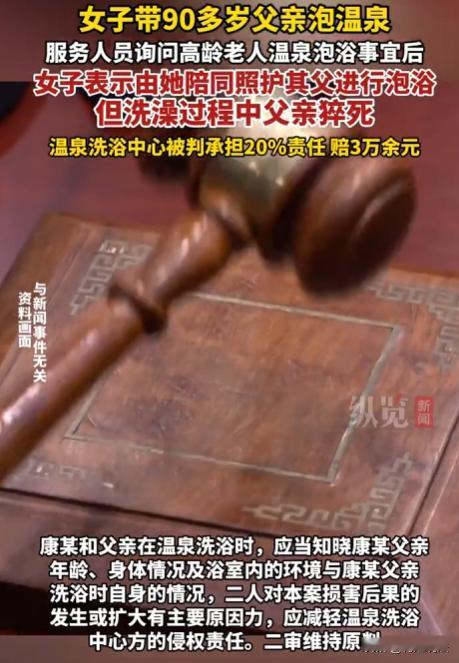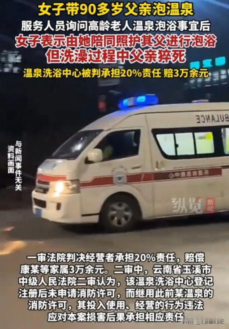 云南昆明,康某带90多岁父亲去温泉洗浴中心泡澡,买票前她明确会全程陪同照顾,进去没多久老人出意外,工作人员虽第一时间拨打急救电话,老人还是不幸离世,康某认为洗浴中心该负责,将其告上法庭索赔,洗浴中心觉得冤枉,法院的判决结果却出人意料。 2024年11月23日下午,康某看着90多岁的父亲,想着老人年纪大了,平时活动少,泡泡温泉也能舒服些,带着父亲来到某温泉洗浴中心。 到前台后,见老人年事已高,出于谨慎提醒康某,泡浴对于高龄老人来说存在一定风险。 康某说:父亲身体状况还不错,而且自己会全程陪同照顾,不会有问题的。 老人也在一旁点头,表示自己想试试。 工作人员见此,便收取了120元洗浴费,带着他们进了浴池。 刚进浴池,康某扶着父亲,慢慢走进水里,找了个水温适宜、位置合适的地方让父亲坐下。 康某守在旁边,时不时的还问问父亲感觉怎么样。 可意外还是发生,工作人员听到声音,赶紧跑过去,发现康某的父亲状况很不好,脸色苍白,呼吸急促。 工作人员马上拨打了120急救电话,同时按照所学的急救知识,对老人进行简单的急救措施。 医护人员赶到了现场,他们迅速展开急救,可尽管尽了最大努力,还是没能挽回老人的生命。 经过警方的详细调查,认定老人属于正常 死 亡。 康某觉得洗浴中心应该为父亲的死负责,于是,她起诉洗浴中心,要求进行赔偿。 康某说: 我父亲是在你们洗浴中心出的事,你们就应该承担责任。你们明知道我父亲年纪大了,却没有采取更周全的保护措施,这才导致悲剧发生。 洗浴中心的负责人一脸委屈地说: 我们当时已经提醒过你们泡浴有风险了,而且你们也承诺会全程陪同照顾。 老人出事后,我们工作人员第一时间就拨打了急救电话,还进行了急救,我们已经尽到了自己的义务,凭什么还要我们赔偿? 洗浴中心对于高龄老人进入浴池,除了口头提醒,是否应该有更明确、更严格的措施呢? 民法典还规定,经营场所、公共场所的经营者、管理者或者群众性活动的组织者,除了要尽到通常的注意义务外,还应当全面尽到安全保障义务。 洗浴中心没有消防许可就营业,以及存在多处不符合行业规范的隐患,这就说明它没有全面尽到安全保障义务。 所以,洗浴中心在这起事件中是有一定过错的。 虽然老人已经90多岁高龄,但法律上认定他为完全民事行为能力人。 这意味着他对自己的身体状况有清晰的认知,能够判断泡浴可能带来的风险。 在这种情况下,老人仍然选择泡浴,这就说明他对自身的行为存在一定的过错。 法院审理认为: 洗浴中心虽然进行了风险提示,但对于高龄老人进入浴池这种特殊情况,没有采取足够有效的防范措施,存在一定的过错。 而康某作为陪同人员,对老人的安全也有不可推卸的责任。 最终,法院判决洗浴中心承担20%的责任,赔偿康某3.6万余元。 洗浴中心对这个判决结果不服,觉得太委屈了,于是提起了上诉。 二审法院,经过再次审理,认为一审判决认定事实清楚,适用法律正确,维持了原判。 在公共场所,对于特殊群体,商家到底应该承担多大的安全保障责任呢? 从法律层面来说,商家有义务为消费者提供一个安全的环境,对于可能存在的风险要进行合理提示和防范,但对于一些不可预见、不可避免的情况,也不能过度苛责商家。 在生活中,无论是商家还是消费者,都应该增强安全意识和责任意识,商家要不断完善自己的安全保障措施,为消费者提供更安全的服务,消费者也要对自己的行为负责,在享受服务的同时,注意自身安全。
