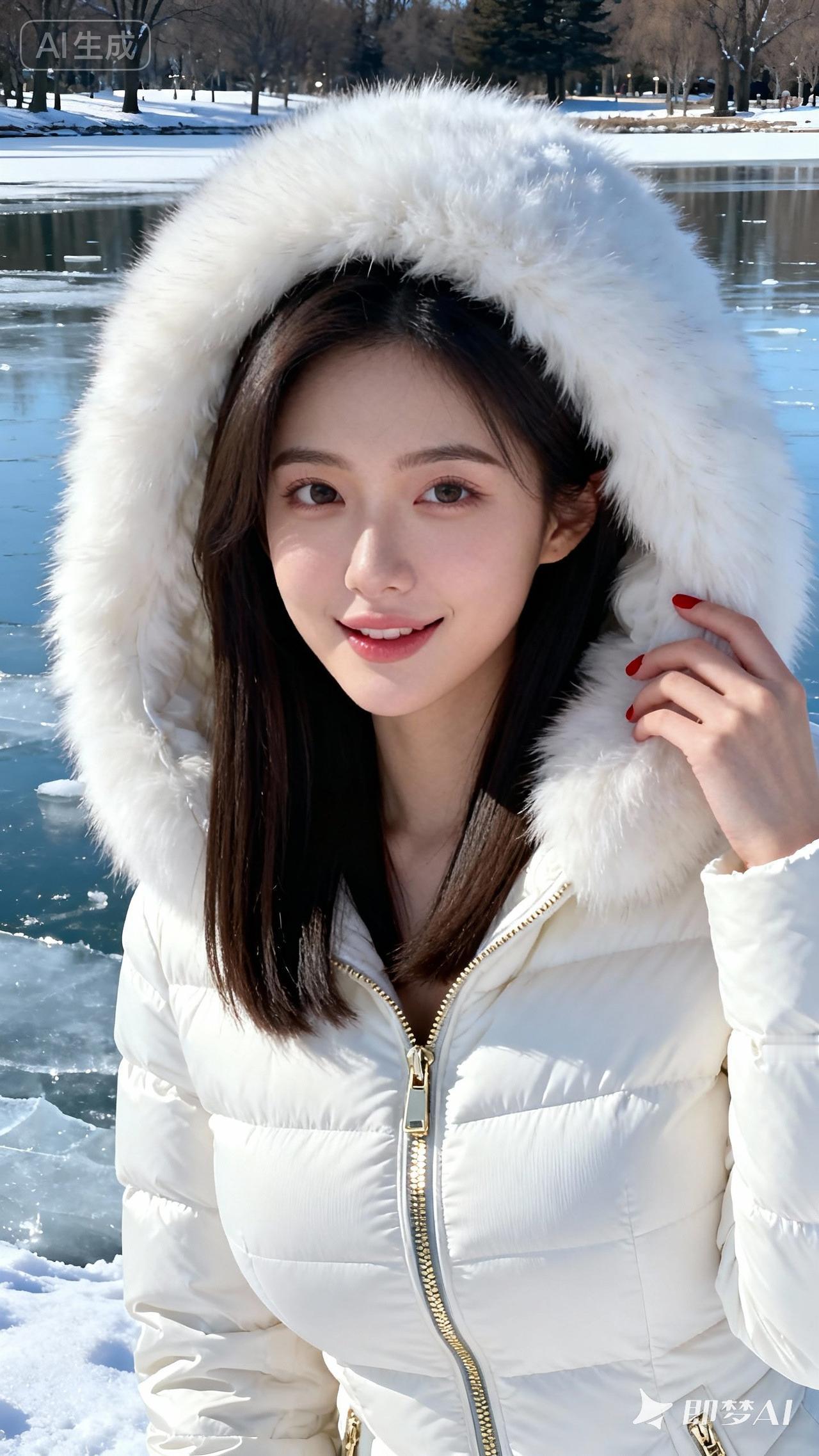 冬日生活打卡季 冬日雪景下的时尚穿搭,白色羽绒服搭配蓝色牛仔裤和高跟鞋,尽显优雅