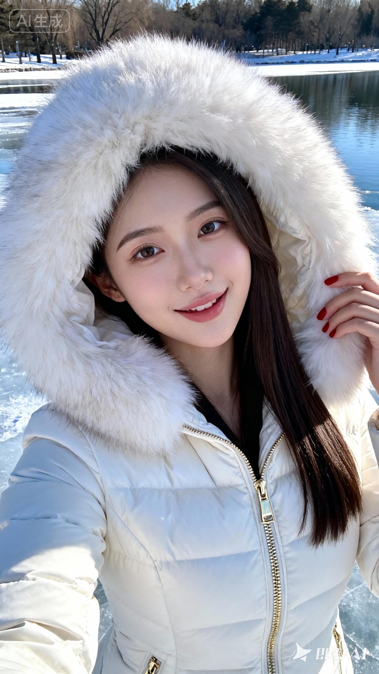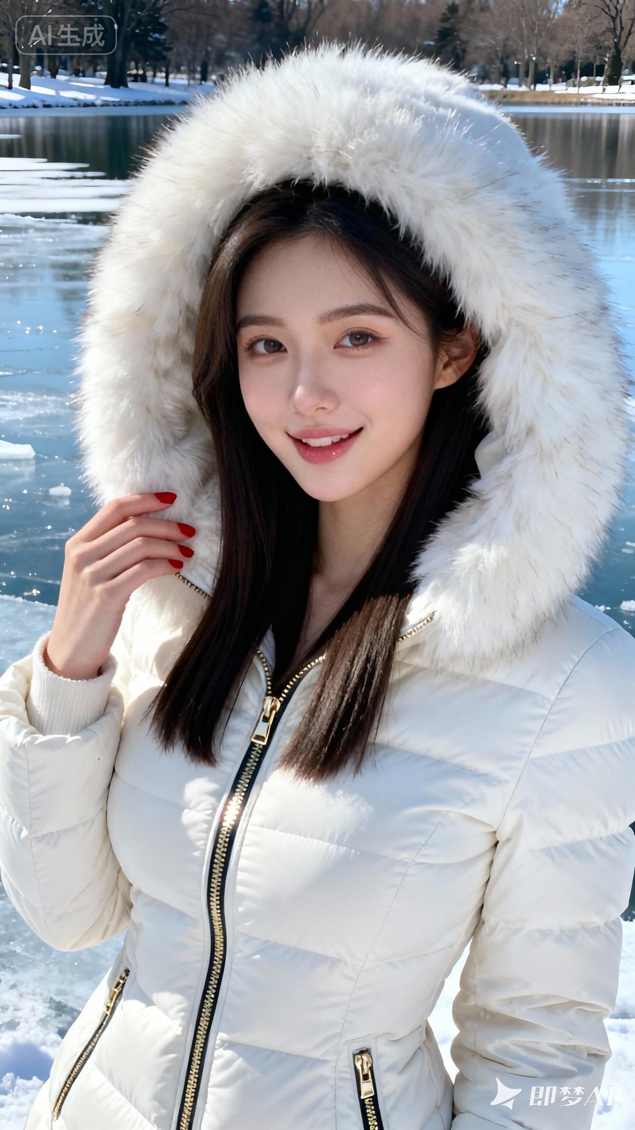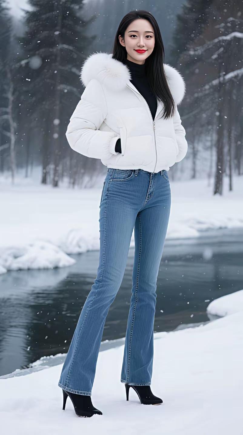 冬日生活打卡季 冬日雪景下的时尚穿搭,白色羽绒服搭配蓝色牛仔裤和高跟鞋,尽显优雅与温暖。