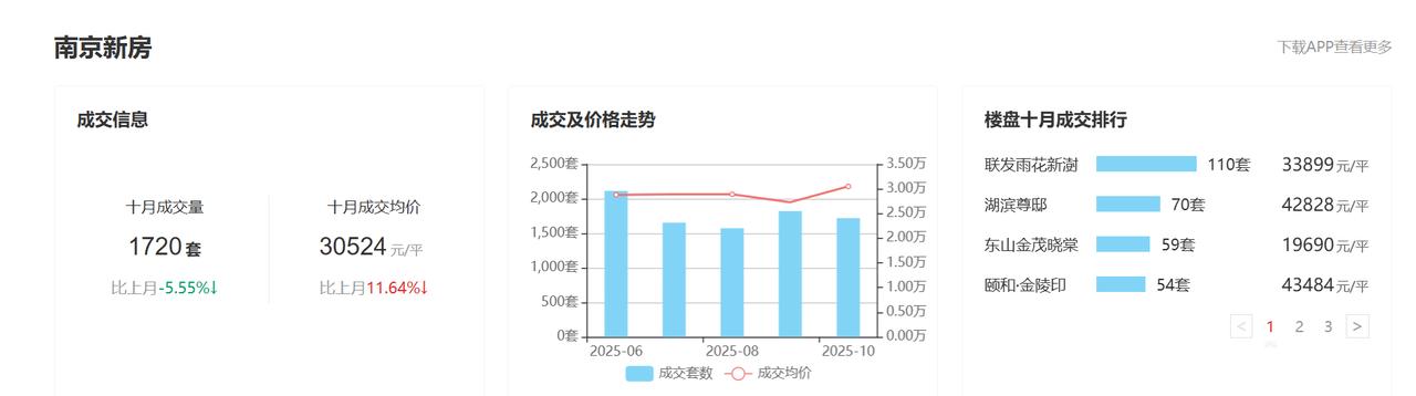 2025年10月,南京联发雨花新澍成交110套,均价33899元; 2025年10月,南京湖滨尊邸成交70套,均价42828元; 2025年10月,南京东山金茂晓棠成交59套,均价19690元; 2025年10月,南京颐和金陵印成交54套,均价43484元; 2025年10月,南京绿城金基沁百合成交46套,均价50519元; 2025年10月,南京山语春风成交43套,均价14903元; 2025年10月,南京联发华发嘉和华府成交39套,均价37123元; 2025年10月,南京中海观江樾成交35套,均价24712元; 2025年10月,南京映秦淮成交34套,均价41077元; 2025年10月,南京尚峰尚水成交32套,均价19005元。 数据说明:以上均价数据,均来自房天下数据,只是作为数据分析的参考,下面漫心r就把整理出来的数据进行一个初步的分析,和大家分享一下感受: 10月的南京楼市堪称 冰火两重天,10月南京新建商品住宅价格环比上涨0.37%,同比上涨1.95%。新房市场表面微涨,但不同项目的销量和价格却是天壤之别。 本月成交最多的楼盘是雨花台区的雨花新澍,单月成交112套,是南京10月住宅销售套数、面积、总金额的三冠王,热销的原因是因为精准的抓住了软件谷板块的年轻刚需群体。69平方米的户型使用率接近100%,对年轻人非常友好,社区内还配置了电竞房、共享办公盒子等设施。 同样,东山金茂晓棠以19690元的均价成交59套,主打89平方米小户型,总价也比较合理。这个项目从今年5月以来的认购套数较一季度月均上涨25%,较4月上涨近100%。 在改善型住房方面,绿城金基沁百合以50519元的均价成交46套,其实这个销量也并非偶然,南京持续实施住宅品质改善提升举措和住宅品质提升设计指引,优化容积率、层高、飘窗等规划设计指标。目前,全市已上市19个、约5900套改善型住宅。 业内人士表示,当下“房子是用来住的”这句话已深入人心,现在购房者主要是关注居住品质,现在的南京楼市正在经历一场从“有房住”到“住好房” 的深刻变革。