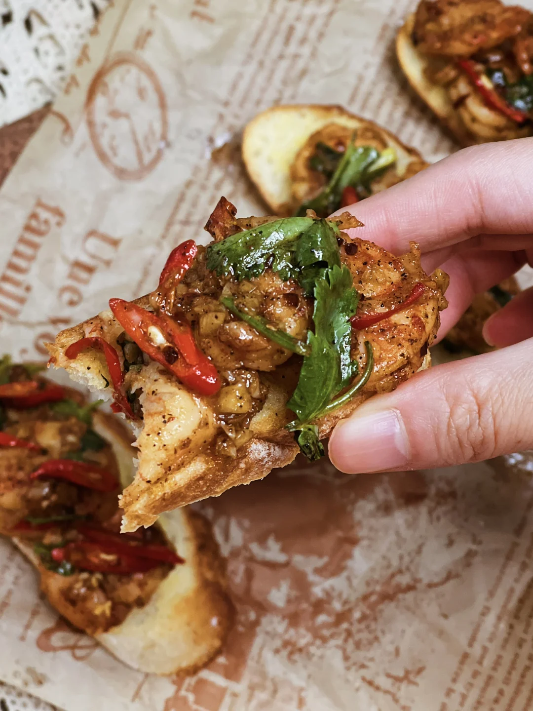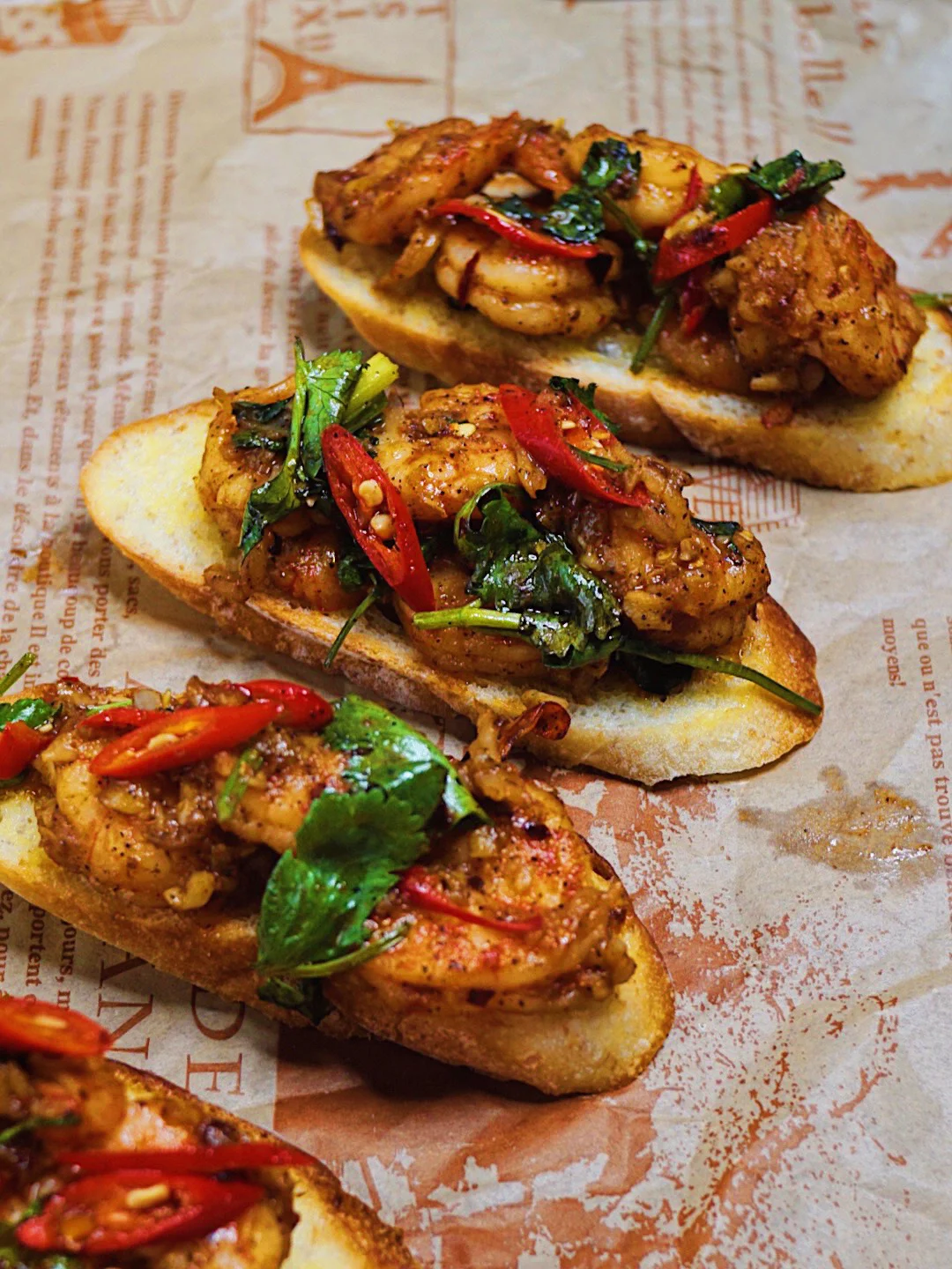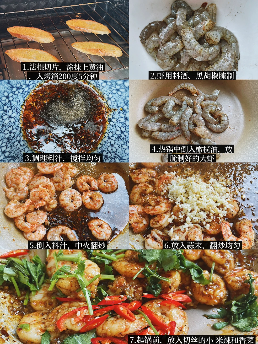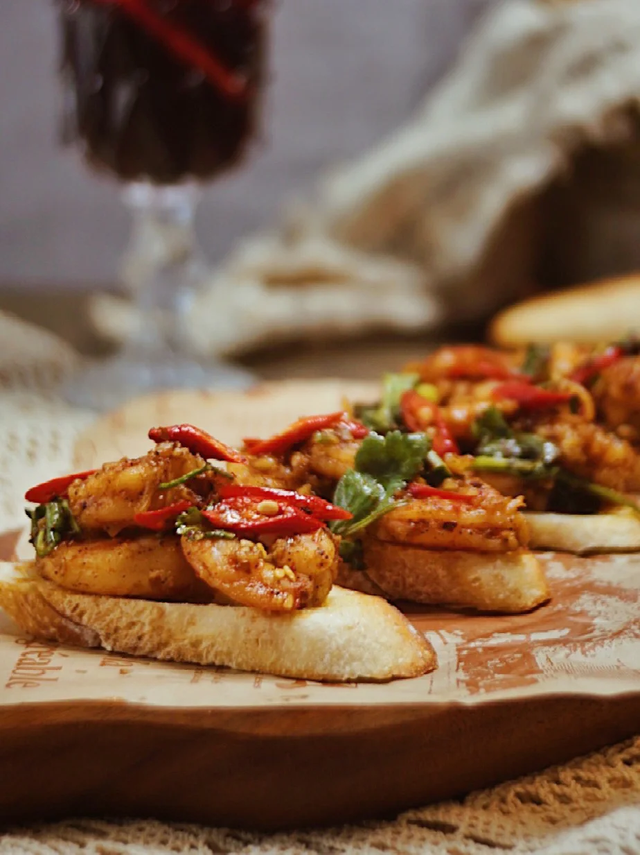 法棍片涂抹上黄油和蒜末,放入烤箱烘烤。单吃就hin美味了。再放上有油泼辣子和小米辣的大虾🦐酥脆焦香的辣口美食。配上一杯红酒🍷在家也能享用美味料理啦~