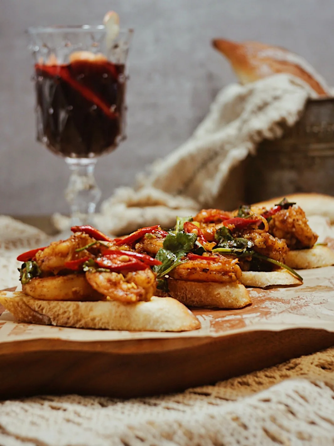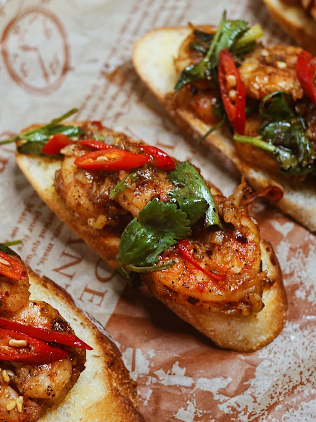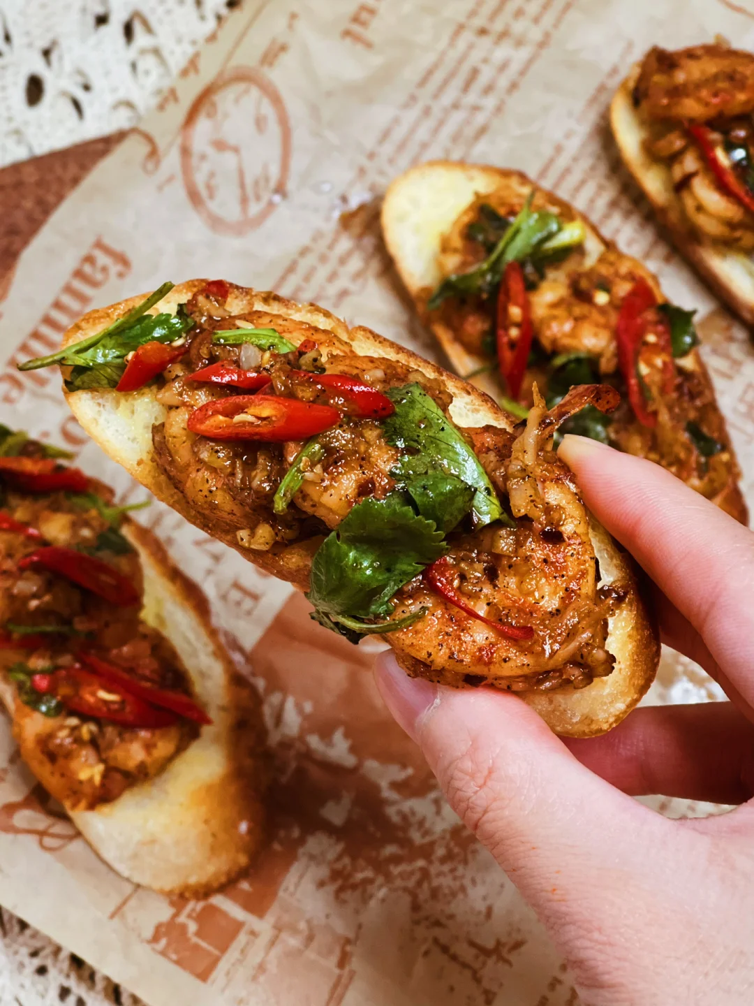 法棍片涂抹上黄油和蒜末,放入烤箱烘烤。单吃就hin美味了。再放上有油泼辣子和小米辣的大虾🦐酥脆焦香的辣口美食。配上一杯红酒🍷在家也能享用美味料理啦~