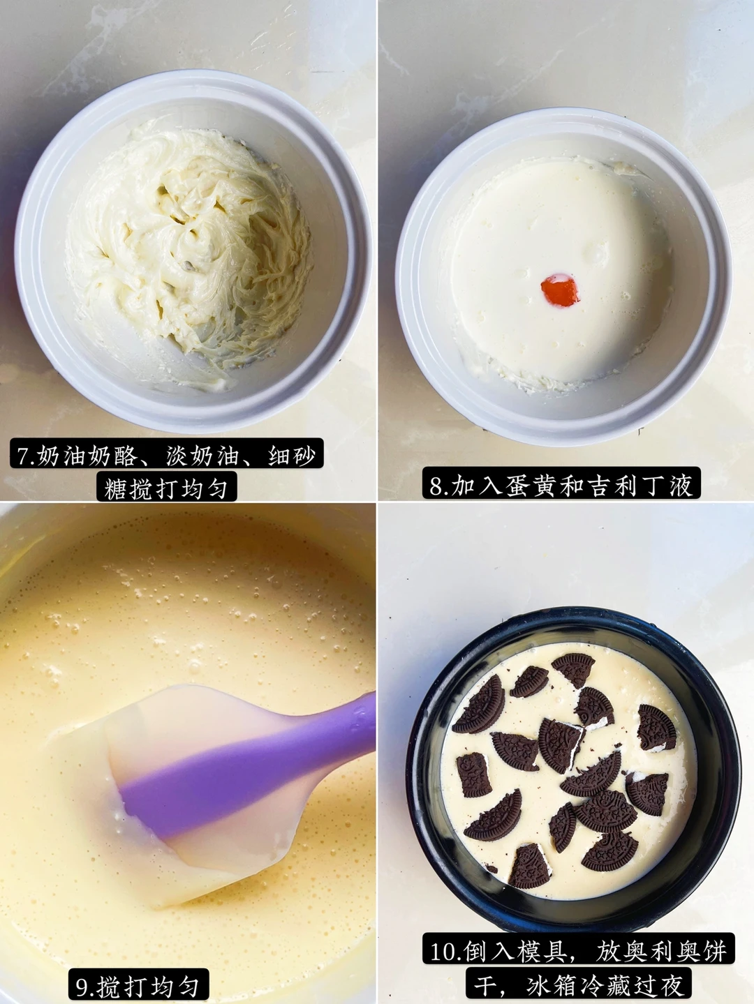 6️⃣倒入模具,中间放上奥利奥饼干,放冰箱冷藏过夜