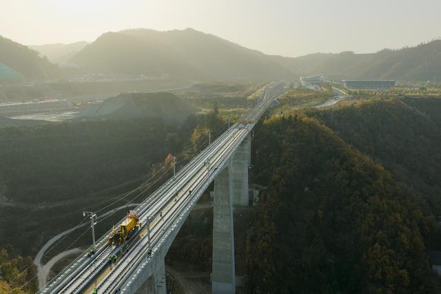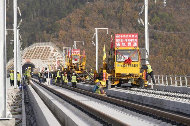 11月27日,九派新闻获悉,最后一对500米长钢轨在神定河大桥上平稳铺设就位,西安至十堰高速铁路(下简称西十高铁)全线铺轨施工圆满完成,为线路开通运营奠定坚实基础。