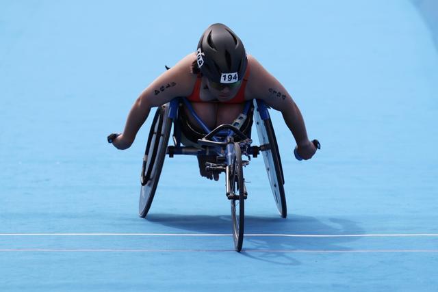 11月27日上午,广东肇庆砚阳湖公园,残特奥会铁人三项开赛。在PTWC(轮椅组)中,广东铁三队女队员伍荧荧夺金、王文娟夺银。