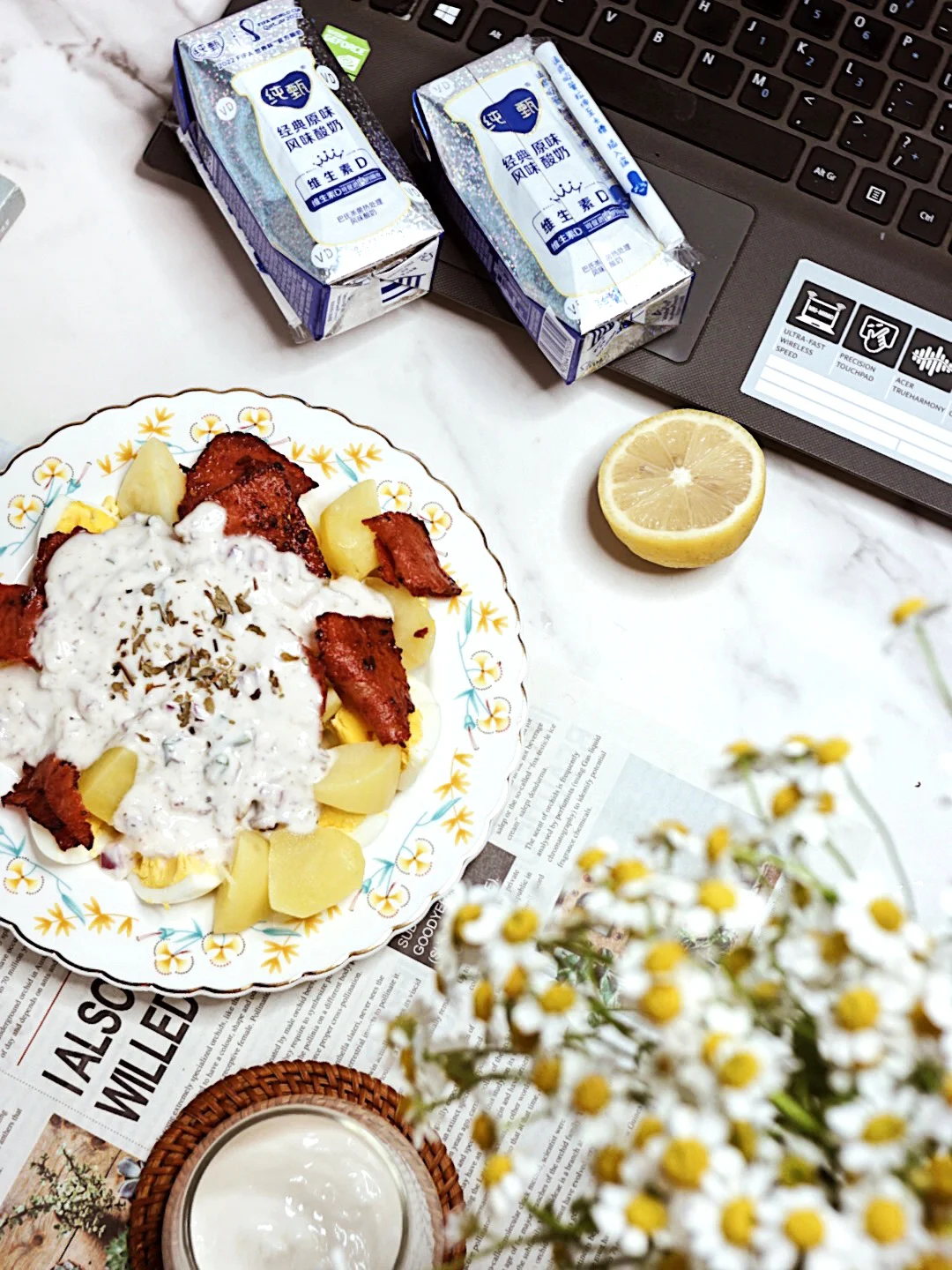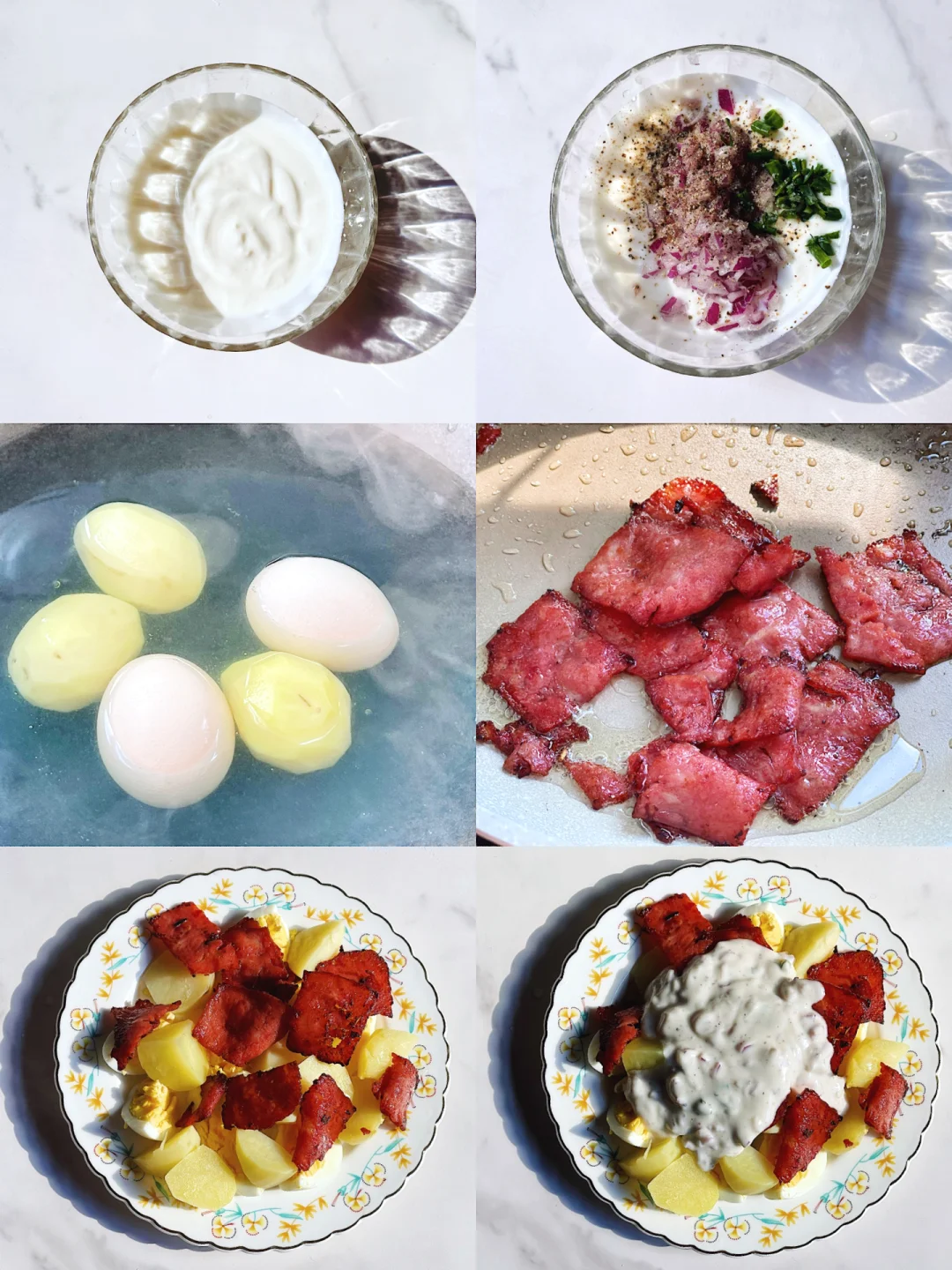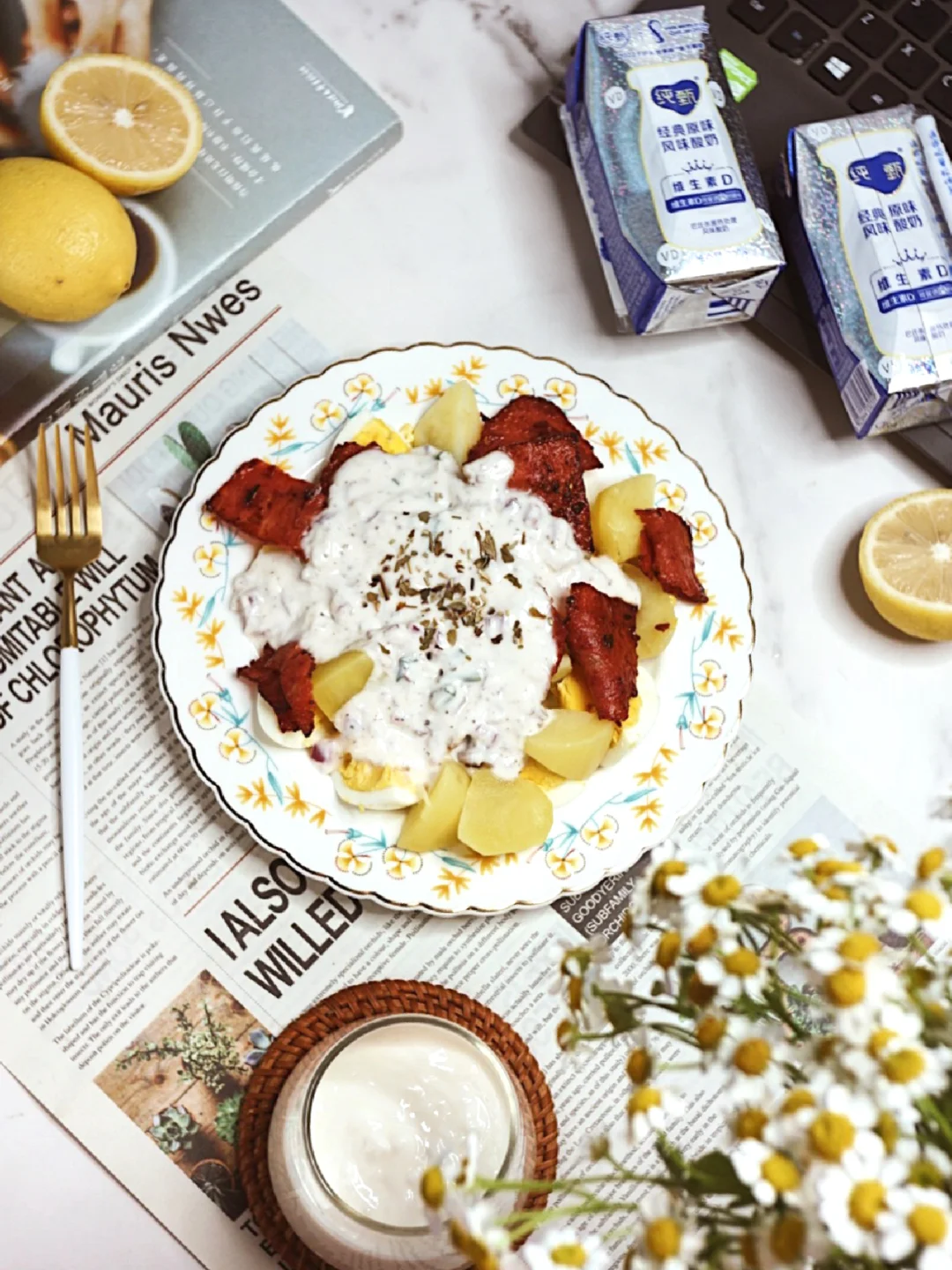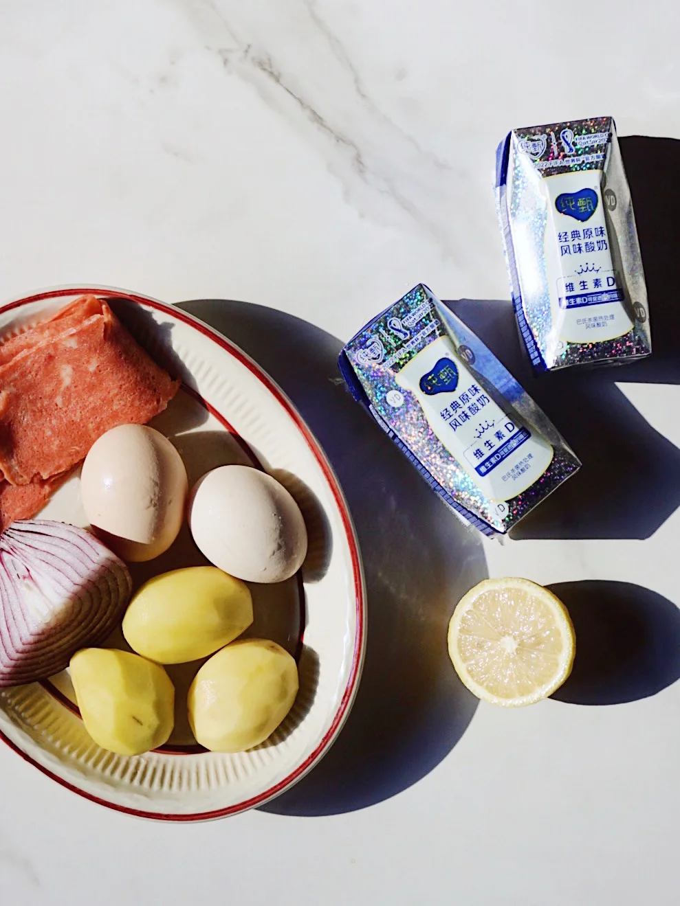 土豆、鸡蛋、培根、酸奶酱(纯甄VD酸奶、1勺洋葱碎、柠檬汁+黑胡椒+葱花少许)