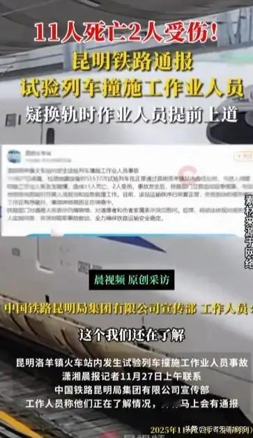 太揪心了!11月27日凌晨,检测地震设备的55537次试验列车在正常通过昆明洛羊镇站内曲线处时,与进入线路的施工作业人员发生碰撞,造成11人死亡、2人受伤的事故。 这起突如其来的悲剧,让无数人的心震碎了。原本平静的夜晚,突然被一声巨响打破,生命的脆弱在瞬间展现得淋漓尽致。事故发生的地点,是一条本应平稳运行的铁路线路,然而一次普通的试验,竟酿成了无法挽回的惨剧。这不仅仅是一起简单的事故,更折射出我们对安全管理的深刻反思。 在这个高速发展的时代,工程的繁忙、进度的追赶似乎成为常态,但我们是否也忽略了最基本的安全底线?那些奋战在一线的施工人员,为了城市的建设默默付出,却也因为疏忽或管理不到位,付出了生命的代价。每一次“试验”,都应是对安全的严肃检验,而不是成为“走钢丝”的危险游戏。 这场悲剧引发的不仅是哀悼,更是对制度、责任和安全文化的深刻反思。我们不能让悲剧再次重演,也不能让生命在疏忽中轻易逝去。每个人都应成为安全的守护者,只有这样,才能真正让“平安”成为城市最温暖的底色。读到这里,你是否也在思考:我们还能怎样守护每一条生命的安全?