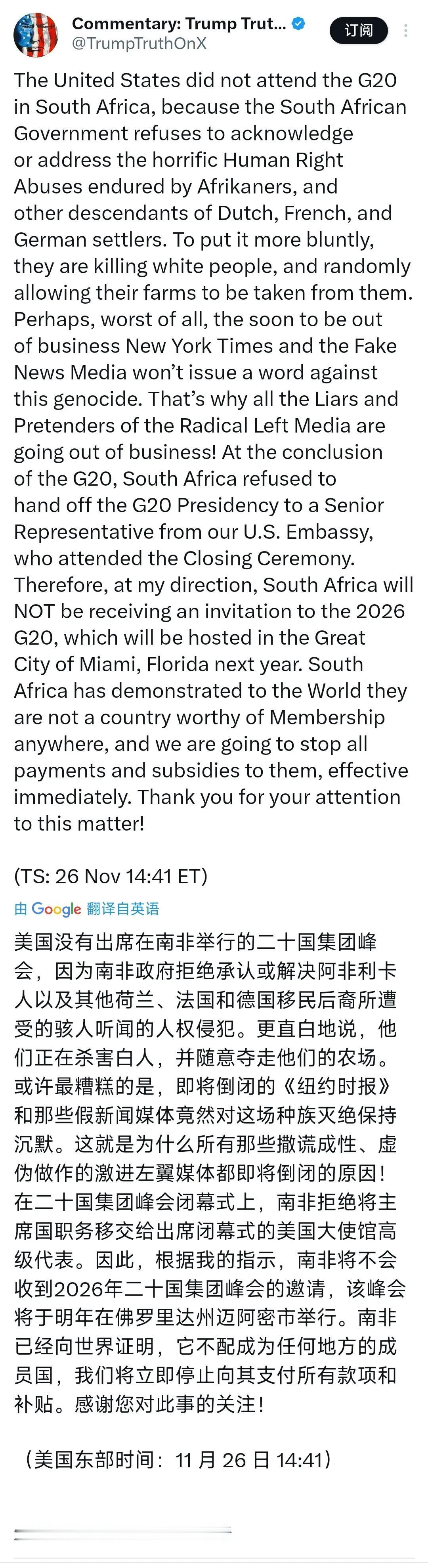 特朗普今天(北京时间11月27日)表示,明年的美国G20峰会,G20成员国南非将不会收到邀请。特朗普发文写道:“美国没有出席在南非举行的二十国集团峰会,因为南非政府拒绝承认或解决阿非利卡人以及其他荷兰、法国和德国移民后裔所遭受的骇人听闻的人权侵犯。更直白地说,他们正在杀害白人,并随意夺走他们的农场。或许最糟糕的是,即将倒闭的《纽约时报》和那些假新闻媒体竟然对这场种族灭绝保持沉默。这就是为什么所有那些撒谎成性、虚伪做作的激进左翼媒体都即将倒闭的原因!在二十国集团峰会闭幕式上,南非拒绝将主席国职务移交给出席闭幕式的美国大使馆高级代表。因此,根据我的指示,南非将不会收到2026年二十国集团峰会的邀请,该峰会将于明年在佛罗里达州迈阿密市举行。南非已经向世界证明,它不配成为任何地方的成员国,我们将立即停止向其支付所有款项和补贴。” 网友评论: 特朗普打压南非打压印度打压巴西其实是打压金砖组织,他还逼印度退出金砖,其实是忌恨金砖组织推行去美元化,这个才是美国最害怕的事。 老美这么做,起码让人想做什么有所顾忌。或许国际上更为有效。中国传统是不是太斯文了,得总结总结。 G20集团峰会不需要主席国邀请成员国都可以参加,除非主席国拒发签证。就算美国拒签,南非也会申请。南非不在乎能不能去,只先做自已能做的事。 把G20当自家后花园,想踢谁就踢谁?既拿种族主义当借口,又践踏国际规则,霸权嘴脸藏都不藏了。 各位朋友怎么看?欢迎在评论区留言讨论