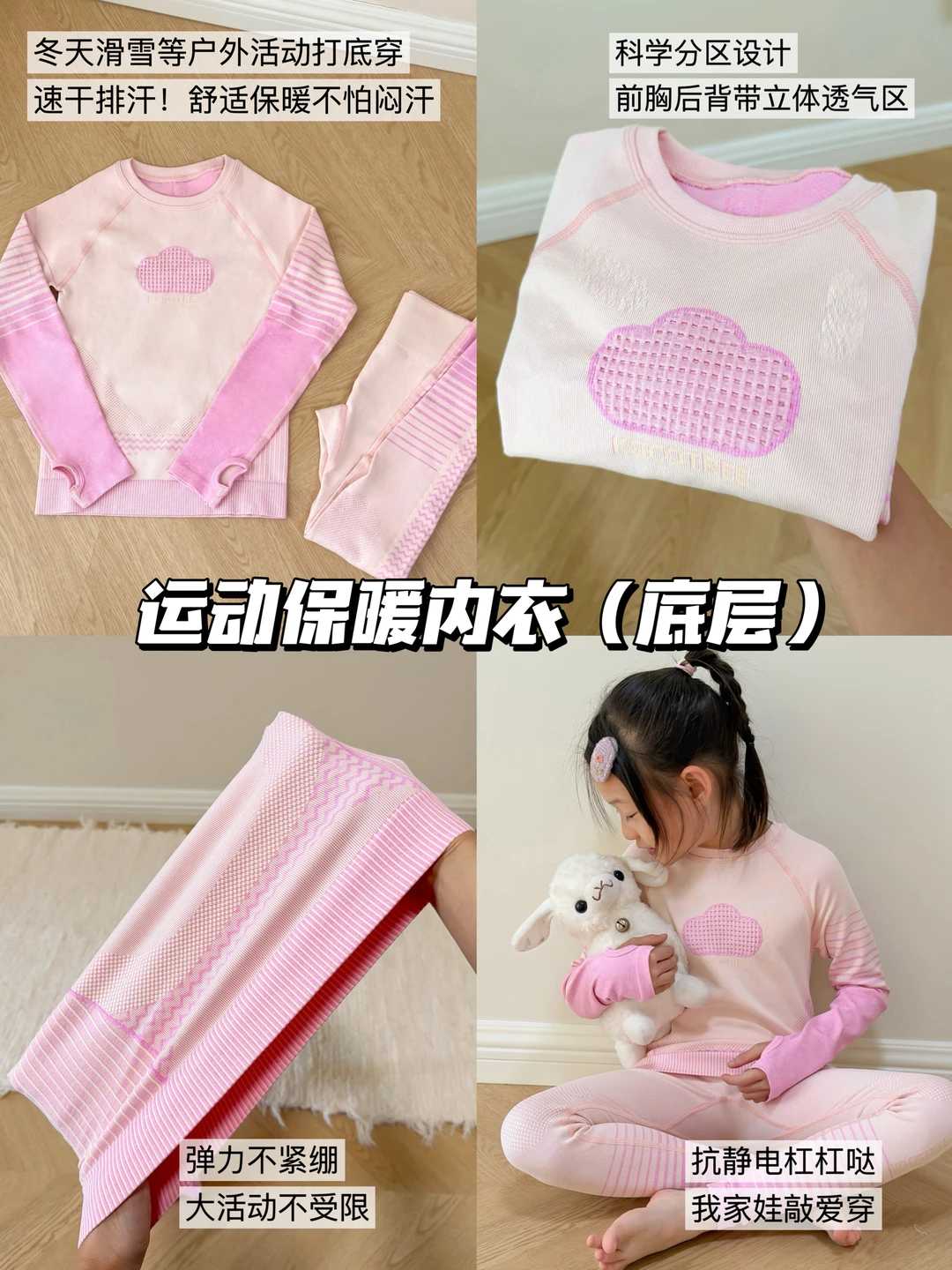 1️⃣ 底层:高弹亲肤,舒适度高,关键是透气排汗💦,室内暖气足,孩子玩雪玩疯了易出汗,捂汗易着凉。