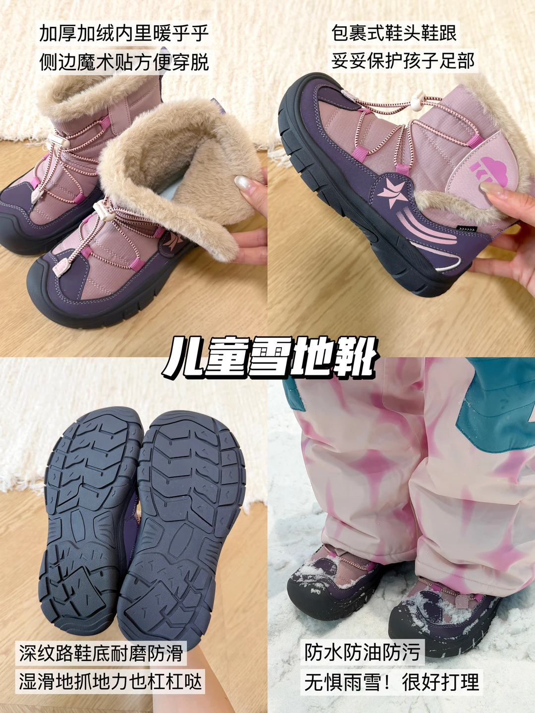 雪地靴选内里柔软厚绒,孩子喜欢踢雪踩雪,重点看鞋头加固设计和防水防雪力,弄湿了脚会速冻😂,鞋底防滑也很关键摔跤真的痛!建议选可调节魔术贴穿脱更方便,包裹紧也更保暖~